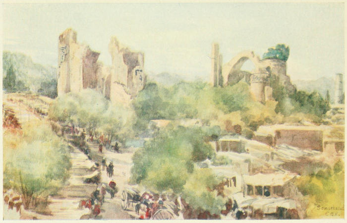 Strolling down the steep hill-side into a grove of trees below, we came to a busy scene. The trees rise out of a large terrace, where handsome carpets were spread on the ground, on which were seated parties[219] of devotees engaged in conversation or in prayer, while their horses were tethered hard by in the shade. Close at hand servants were busily preparing food at various fires under a shed, and it looked as if it were some picnic instead of a religious exercise. Evidently the worshippers were going to make a day of it, and they looked highly picturesque with their many-coloured robes and white turbans.