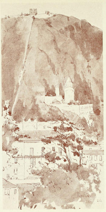 Tiflis is noted for its sulphur baths, and attracts many visitors from different parts of Russia on that account. After a drive round the town we went up the funicular railway, and from the summit a magnificent panoramic view is to be had, for Tiflis is in the heart of the mountains. The ruins of the old walls can be traced on the north side of the river, and the old Georgian fortress, now included in the botanical garden. Tiflis was founded in the fifth century, and became the capital of the Georgian kingdom in the beginning of the sixth century. It fell into the hands of Russia in 1801, and the feelings of the Georgians are still intensely bitter after a century of foreign rule. It is a cosmopolitan city, and Professor Brugsch estimates that seventy languages may be heard in it. One unusual feature of the population is that the men are double the number of the women.