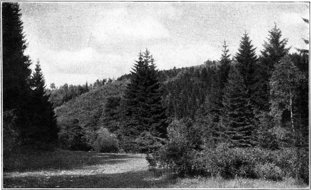 Weiter talaufwärts ist das Wasser des Baches in einem stark verschlammten und verwachsenen Weiher aufgestaut, und eine Mühle mit Gastwirtschaft bildet das letzte sächsische Grundstück der weltabgeschiedenen Siedelung. (Abb. 5.) Denn nun sind wir in voller Natureinsamkeit. Unten die Wiesenaue, rechts der Pfarrbusch mit dem »Pfarrgründel« und dem »Ilmenborn« (Ulmen?), links der böhmische[139] Hang mit dem »Friedhöfel«. Kaum, daß die schmale Linie des Fußweges das Naturbild schneidet, so unberührt erscheint die Landschaft – und doch ist sie ein Kunstprodukt; denn erst ums Jahr 1875 wurde der Talboden planiert und der Bachlauf an den böhmischen Hang gedrückt. Wie das Tal früher aussah, erkennen wir weiter hinten, wo die Grenzsteine zum Bach herabsteigen, wo das Wässerlein in vielen Windungen zwischen Baumgruppen und Alpenheckenrosen sich schlängelt und spärlich bewachsene Steinhaufen die Grasflächen unterbrechen. (Abb. 6.) An diesem hinteren Talstück haftet seit langem der Name »Mordgrund« – warum, ist nicht nachweisbar.