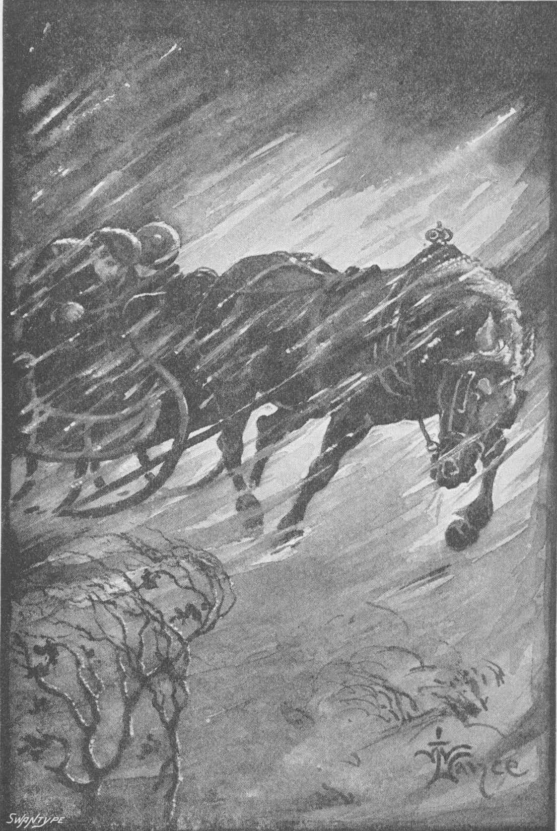 But now they were within half-a-mile of the most dangerous part of all the road, for here there was a terribly steep descent, with a high precipice and sharp curve right at the bottom. More than one fatal accident had already taken place at this place, so Mackenzie set himself to the task of immediately restraining the impetuosity of his Shetland steed. This he might have succeeded in doing without{9} much difficulty, but for once fate seemed against him, for just at that moment a hare suddenly bounded from a bush of broom, and crossed the path almost among Larnie’s feet. So startling an apparition caused the nervous little animal to lose all control over himself. Larnie felt as if under the influence of some dreadful nightmare, and I am convinced this is precisely how horses do feel under such circumstances, and off he dashed at a speed that was perfectly uncontrollable by his driver, and which would have been so even had he been a younger and stronger man.