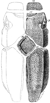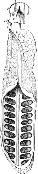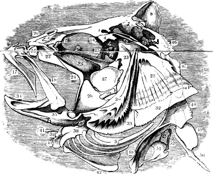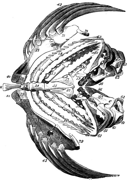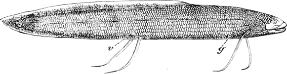 [39] For other illustrations see p. 73, Fig. 35 (palatal view of head); p. 74, Fig. 36 (pectoral skeleton); p. 141, Fig. 60 (gills); p. 148, Fig. 65 (lung); p. 151, Fig. 67 (heart); p. 134, Fig. 57 (intestine); p. 165, Fig. 77 (ovary).