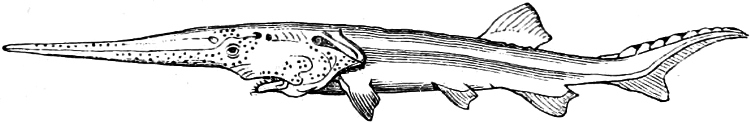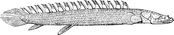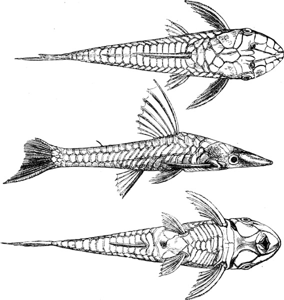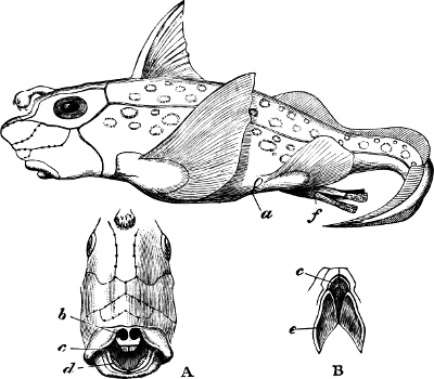 [7] The Ganoids formed at former epochs the largest and most important order of fishes, many of the fossil forms being known from very imperfect remains only. It is quite possible that not a few of the latter, in which nothing whatever of the (probably very soft) endoskeleton has been preserved, should have to be assigned to some other order lower in the scale of organisation than the Ganoids (for instance, the Cephalaspidæ).