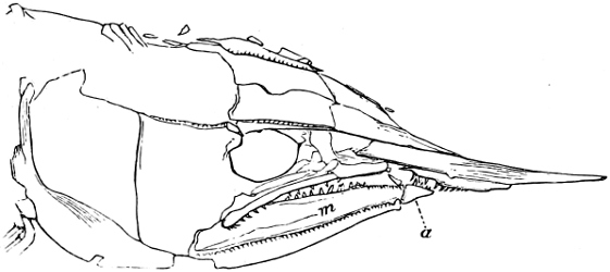 [44] The systematic affinities of these extinct genera are very obscure. Cope places them, with others (for instance Protosphyræna, which has a sword-like prolongation of the ethmoid), in a distinct family, Saurodontidæ: see “Vertebrata of the Cretaceous Formations of the West,” 1875.