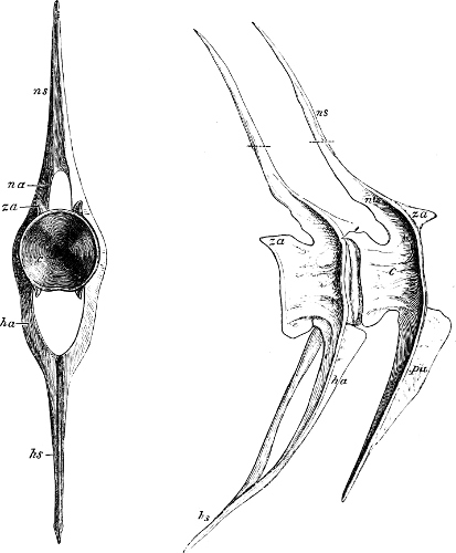 [6] C. Hasse has studied the modifications of the texture of the vertebræ and the structure of the Chondropterygian skeleton generally, and shown that they correspond in the main to the natural groups of the system, and, consequently, that they offer a valuable guide in the determination of fossil remains.