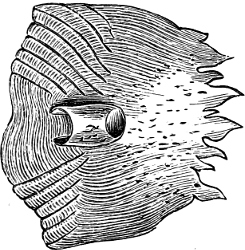 Some Sharks are known to attain to a length of 30 feet, and some Rays to a width of 20 feet. The preservation of such gigantic specimens is much to be recommended, and although the difficulties of preserving fishes increase with their size, the operation is facilitated, because the skins of all Sharks and Rays can easily be preserved in salt and strong brine. Sharks are skinned much in the same way as ordinary fishes. In Rays an incision is made not only from the snout to the end of the fleshy part of the tail, but also a second across the widest part of the body. When the skin is removed from the fish, it is placed into a cask with strong brine mixed with alum, the head occupying the upper part of the cask; this is necessary, because this part is most likely to show signs of decomposition, and therefore most requires supervision. When the preserving fluid has become decidedly weaker from the extracted blood and water, it is thrown away and replaced by fresh brine. After a week’s or fortnight’s soaking the skin is taken out of the cask to allow the fluid to drain off; its inner side is covered with a thin layer of salt, and after being rolled up (the head being inside) it is packed in a cask, the bottom of which is covered with salt; all the interstices and the top are likewise filled with salt. The cask must be perfectly water-tight.
