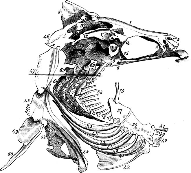 | Axial portion, 51—Vertebra and its parts; terms defined, 51—Skull; bones topographically enumerated, 53—Bones of the limbs, 59—Synonymic list of bones, 59. | [viii] |