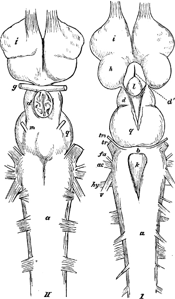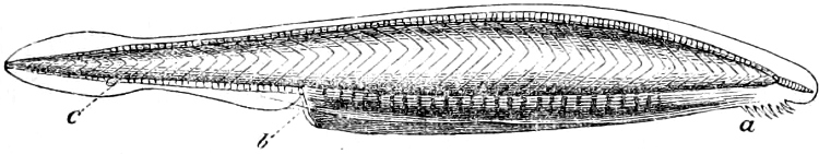 This sub-class is represented by a single family (Cirrostomi) and by a single genus (Branchiostoma);[48] it is the lowest in the scale of fishes, and lacks so many characteristics, not only of this class, but of the vertebrata generally, that Hæckel, with good reason, separates it into a separate class, that of Acrania. The various parts of its organisation have been duly noticed in the first part of this work.
