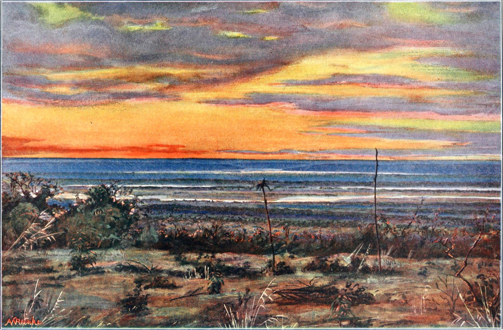 Äußerlich ist das Städtchen ganz das alte geblieben. Im ewigen Wechsel rauschen die blauen Fluten des Meeres vom offenen Ozean her den Lukuledi aufwärts, das weitverzweigte Ästuar bis in die fernsten Krieks hinein füllend; sechs Stunden später strömt all dieses Wasser wieder zurück, dem Osten zu; es ist wie ein ruhiges Atmen des Meerriesen. Gleichmäßig und leise rauschen auch die Palmen über den niederen Hütten der Schwarzen, den winkeligen, schmutzigen Anwesen der Inder und den wenigen Häusern der Europäer. Unter diesen haben die verflossenen Monate bedeutende Veränderungen mit sich gebracht. Von den alten Säulen des Deutschtums hier im äußersten Süden ist fast niemand mehr vorhanden; dafür sind neue Landsleute eingetroffen,[S. 478] und zwar gleich so viel, daß es fast schwer hält, eine Wohnung zu bekommen. Wären wir in einer englischen Kolonie, so würden wir sagen, in Lindi herrscht ein „Boom“; so sagen wir weniger drastisch: das Kapital hat den Süden entdeckt und beginnt ihn wirtschaftlich zu erschließen; alles gute Land soll dem Vernehmen nach schon in festen Händen sein, so daß die Nachkömmlinge wohl oder übel schon zu weiter im Innern gelegenen Geländen werden greifen müssen. Ich persönlich freue mich über diesen Aufschwung des mir liebgewordenen Südens, im übrigen habe ich jedoch genug mit meinen eigenen Angelegenheiten zu tun.