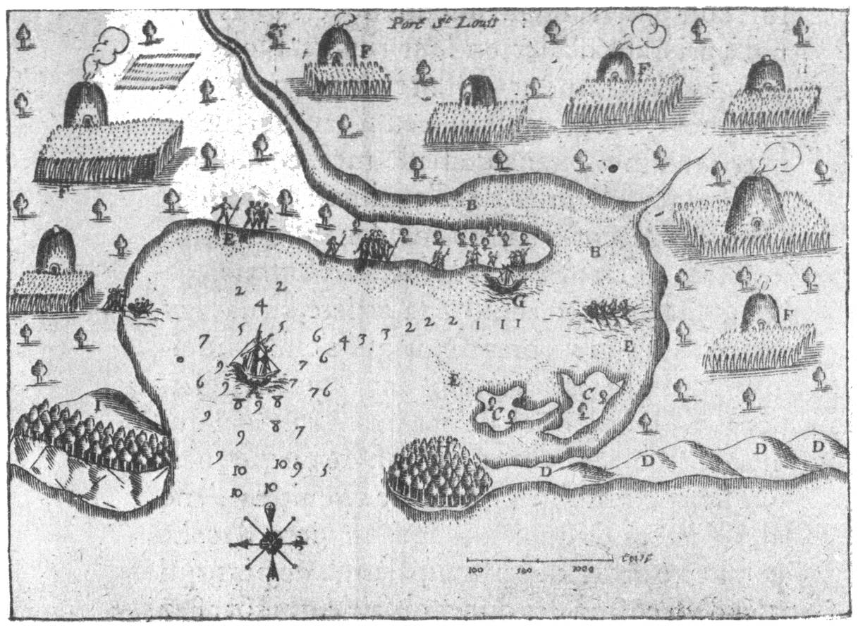 The expedition now sailed southward into Plymouth Harbor. “The next day [July 18] we doubled Cap St. Louis, so named by Sieur de Monts, a land rather low, and in latitude 42° 45’. The same day we sailed two leagues along a sandy15 coast as we passed along which we saw a great many cabins and gardens. The wind being contrary, we entered a little bay [Plymouth] to await a time favorable for proceeding. There came to us two or three canoes, which had just been fishing for cod and other fish, which are found there in large numbers. These they catch with hooks made of a piece of wood, to which they attach a bone in the shape of a spear, and fasten it very securely. The whole thing has a fang-shape, and the line attached to it is made out of the bark of a tree. They gave me one of their hooks, which I took as a curiosity. In it the bone was fastened on by hemp, like that in France, as it seemed to me. And they told me that they gathered this plant without being obliged to cultivate it; and indicated that it grew to the height of four or five feet. This canoe went back on shore to give notice to their fellow inhabitants, who caused columns of smoke to rise on our account. We saw eighteen or twenty savages, who came to the shore and began to dance.” Was this a reminiscence of dancing to the guitar for Pring’s sailor, perhaps? “Our canoe landed in order to give them some bagatelles, at which they were greatly pleased. Some of them came to us and begged us to go to their river. We weighed anchor to do so, but were unable to enter on account of the small amount of water, it being low tide, and were accordingly obliged to anchor at the mouth. I went ashore where I saw many others who received us very cordially. I made also an examination of the river, but saw only an arm of water extending a short distance inland, where the land is only in part cleared up. Running into this is merely a brook not deep enough for boats except at full tide. The circuit of the Bay is about a league. On one side of the entrance to this Bay there is a point which is almost an island, covered with wood, principally18 pines, and adjoins sand banks which are very extensive. On the other side the land is high. There are two islets in this bay, which are not seen until one has entered and around which it is almost dry at low tide. This place is very conspicuous from the sea, for the coast is very low excepting the cape at the entrance to the bay. We named it Port du Cap St. Louis, distant two leagues from the above cape and ten from the Island Cape [Gloucester]. It is in about the same latitude as Cap St. Louis.”
