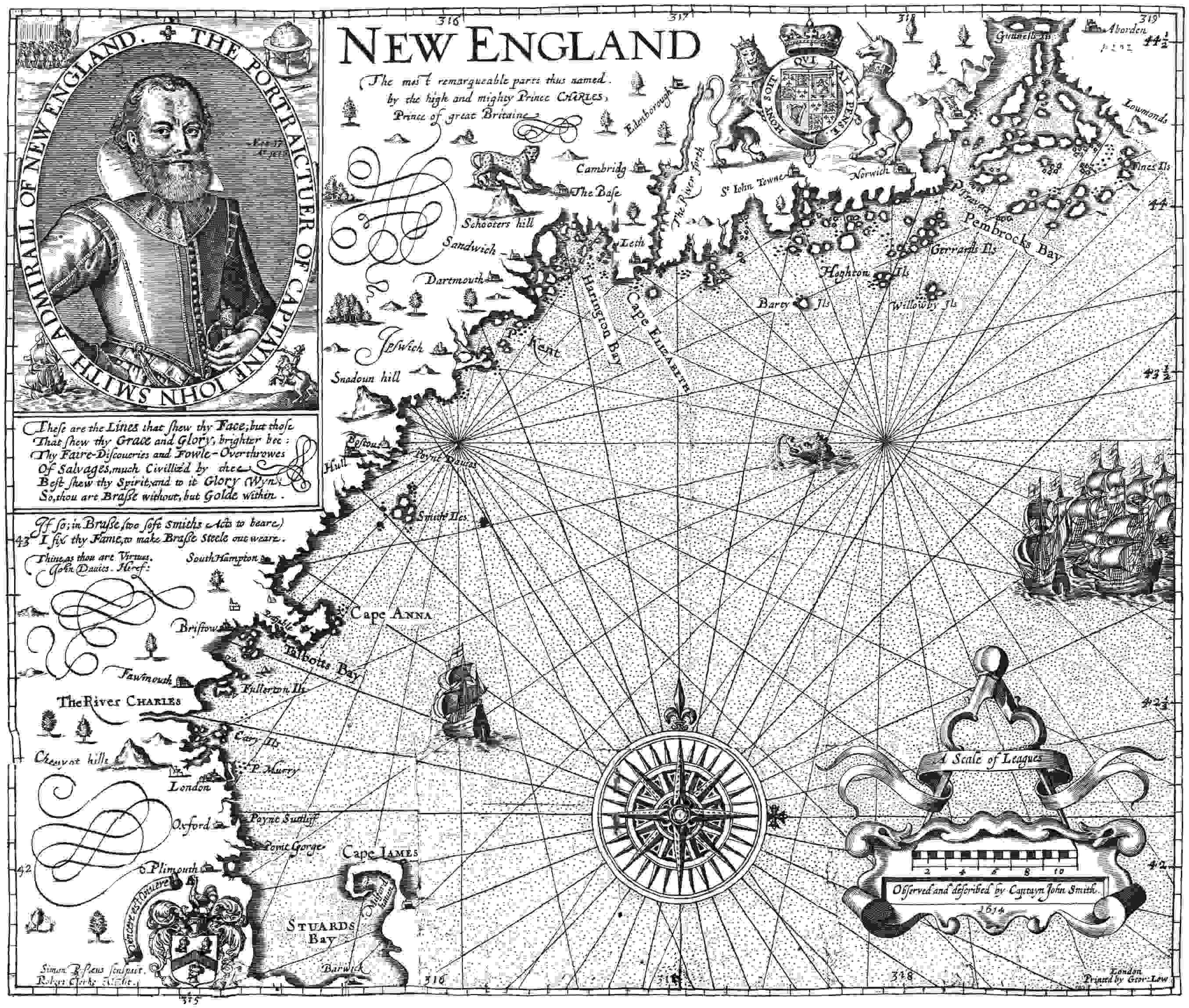 Also in 1614 there came sailing into Plymouth Harbor a man whose map and writings were used by the Pilgrims, though he said that they refused his advice and his leadership. Captain John Smith would like to have been the founder of New England, but had to be content to be its Hakluyt. He named New England, and “Plimouth,” and Massachusetts, and the Charles River and Cape Ann—at least he was the first to publish these names. He produced the best known map of New England of that early period. He spent the last seventeen years of his life writing the history of New England voyages and pamphleteering for its settlement. Yet a succession of misfortunes prevented him from ever revisiting the coast for which he developed such enthusiasm during his three months’ voyage in 1614. Smith had already been governor of Virginia and had experience in what it took to plant a successful23 colony. His writings had unquestionably a strong influence on the Massachusetts colonial undertakings, particularly since he was not afraid of Indians and since he recognized the difference between the bleak coast of Maine and the relatively better-situated Massachusetts area as a site for colonial development.