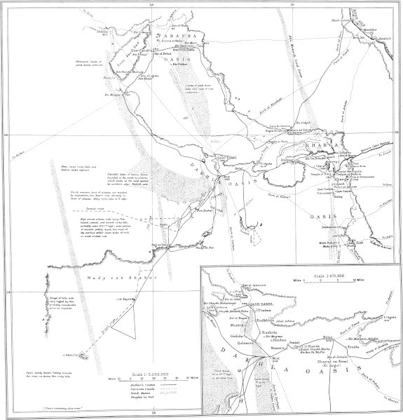 I am under a deep debt of gratitude to the Royal Geographical Society for a most generous loan of instruments; and last, but by no means least, I have to express most cordial thanks to the Survey Department in Egypt for the loan of tanks and instruments and for much valuable advice and assistance. More especially I am under obligations to the following members of this department: To the late Mr. (afterwards Lt.-Col.) B. F. E. Keeling and Mr. Bennett, for calculating some of my astronomical observations; to Mr. J. Craig for his kindness in working out my boiling point and aneroid altitudes; to Dr. John Ball and Mr. H. E. Hurst, who gave me much assistance and so far enlightened my ignorance on the subject as to enable me to take some electrical observations on the sand blown off a sand dune; the former, too, most kindly lent[11] me his electrometer for the purpose of the observations. Mr. Alfred Lucas of this department also kindly analysed some samples of crusted sand that I collected in order to discover the cementing material.