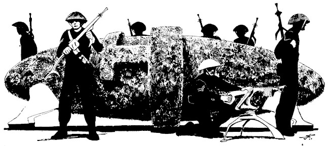 At the final hour, the guards stood nervously around the big metallic cylinder. Within the ring of armed men, Captain Whitter, Lieutenant-Marshal Dilon, and Dr. Rudolf Mier stood, looking at the capsule and waiting.