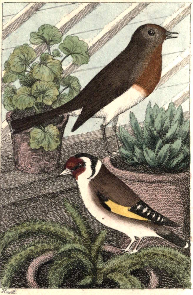 “She then gave me some water, which I found very refreshing, and presently after, one of her sisters coming into the room, I learnt her intentions respecting myself. ‘See, Lucy,’ said she, ‘what a treasure I have.’ ‘A goldfinch! Where did you get it?’ ‘In a manner so extraordinary,[Pg 33] that I shall not easily be prevailed on to part with it. Though I am much averse to slavery, and should not like to keep it entirely a prisoner, yet, as it came to me for protection, I should be unwilling to expose it again to the danger it so lately escaped.’