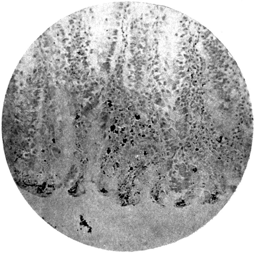 In our own country, John Hunter[4] describes the frequent incidence of “dry bellyache” in the garrison of Jamaica, caused by the consumption of rum which had become contaminated[2] with lead. Many other writers in ancient and historical books on medicine have written on the causation of colic, palsy, and other symptoms, following the ingestion of salts of lead; and as the compounds of lead, mainly the acetate or sugar of lead, were freely used medicinally, often in large doses, opportunities constantly occurred for observing the symptoms produced in susceptible persons. It is not to the present purpose to examine the historical side of the question of lead poisoning, but those interested will find several valuable references in Meillère’s work “Le Saturnisme”[5].