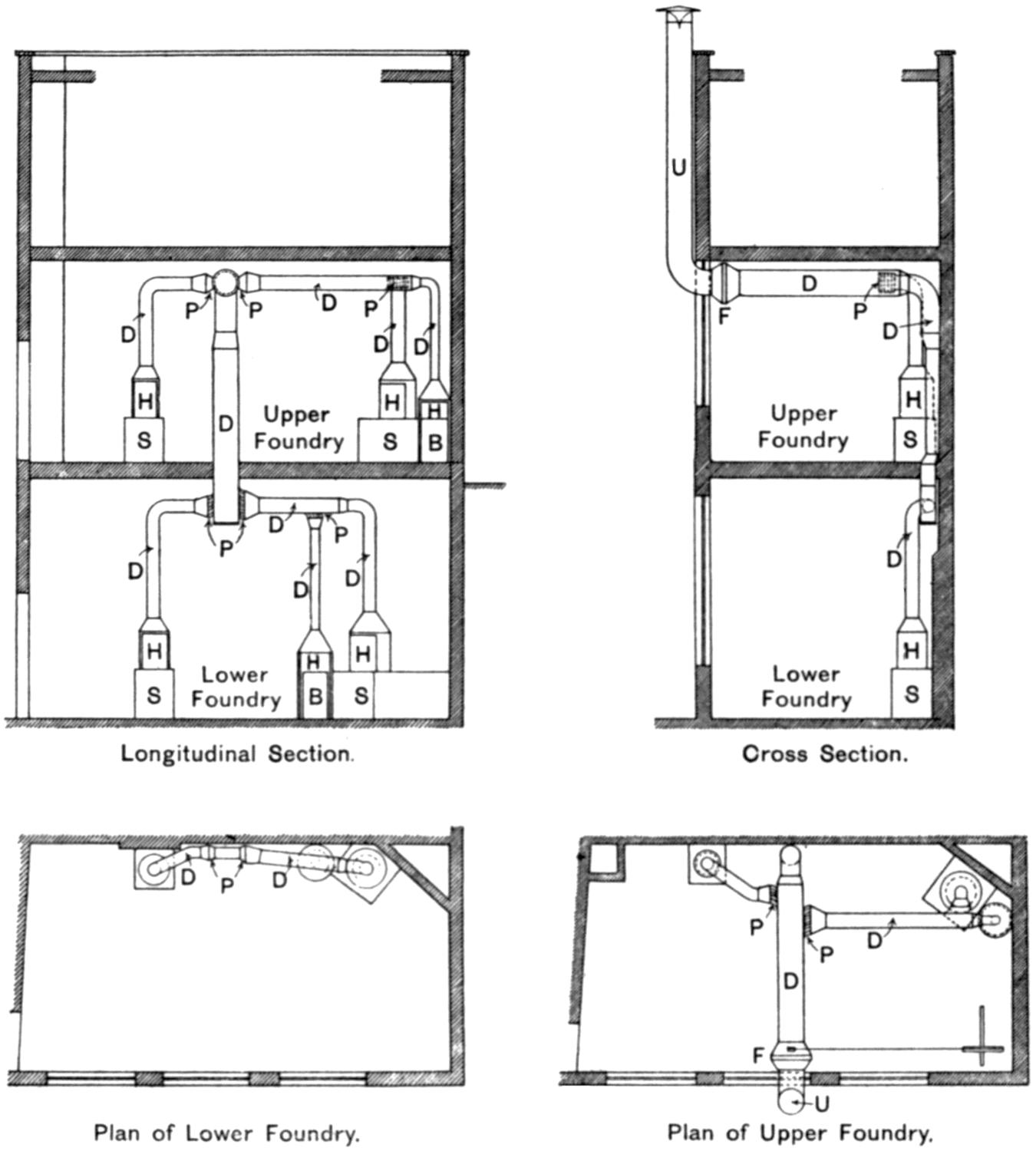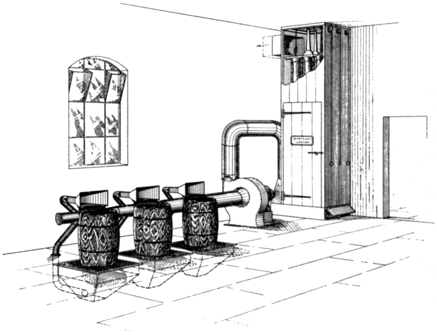 (8) Metal ducts, 9¹⁄₂ inches in diameter. Evidence of ill-health was greatest here, notwithstanding good draught, because the branch ducts were not brought close enough to the point where “heading” was done, but were distant 15 inches from the centre of the post, and “noddling” was done at a distance of 2 feet from the duct, one man standing between the draught and the bar.