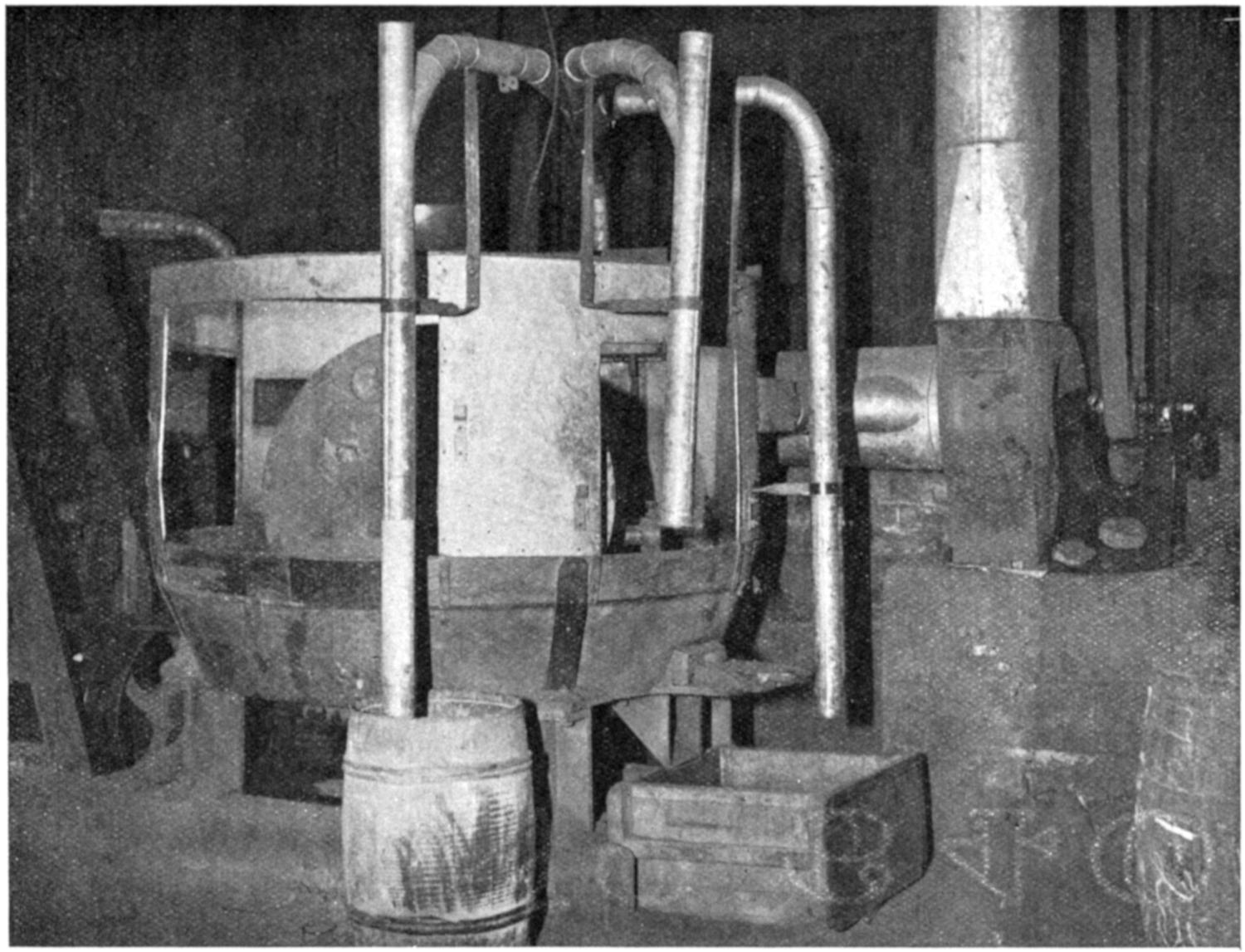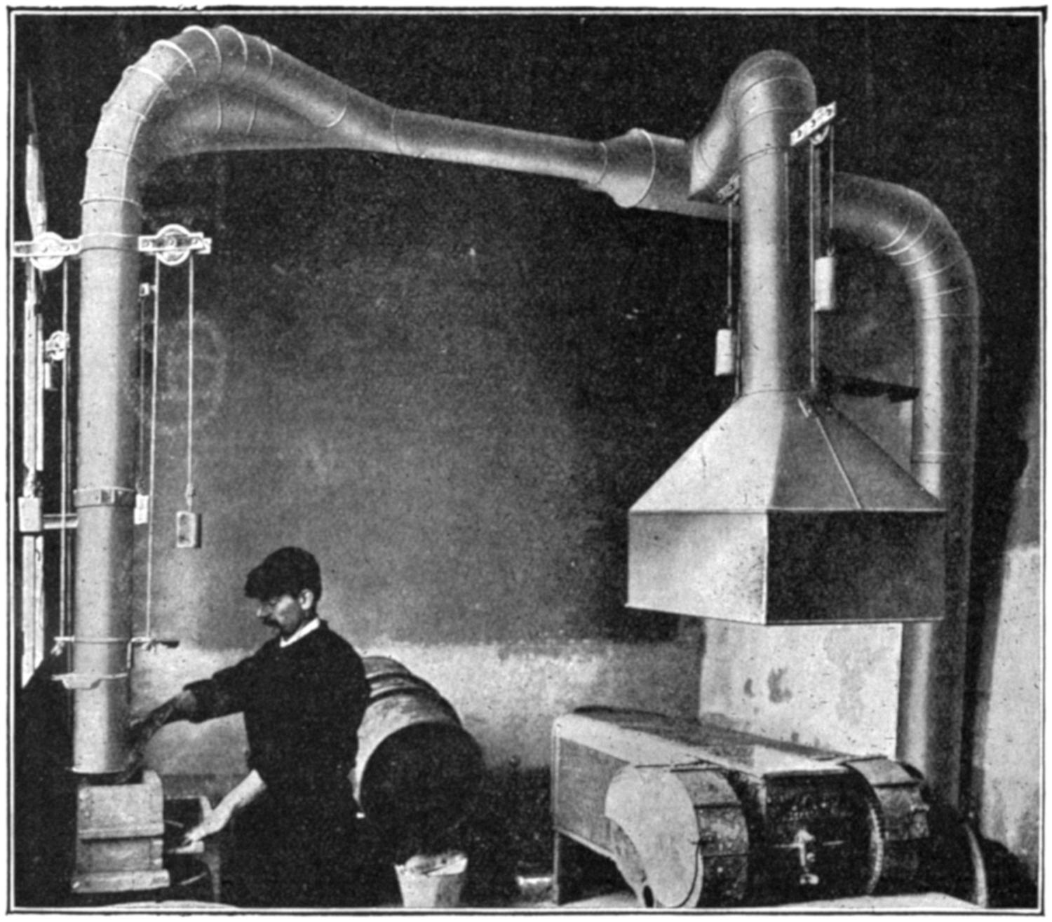 (7) Metal duct distant about 2¹⁄₂ feet from the post, and situated immediately below and not behind the bar. Dust was prevented from rising above the post by a glass screen, the projection[301] of which also prevented the worker from coming too near to, or getting his head over, the post.