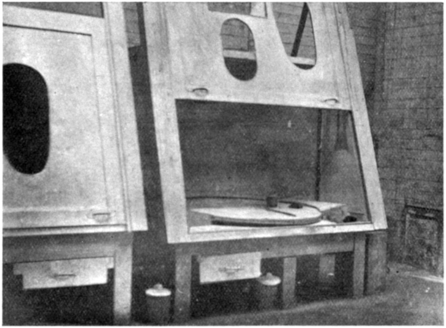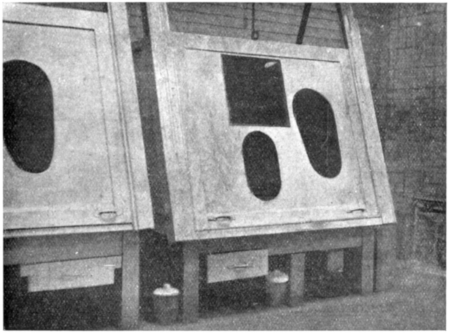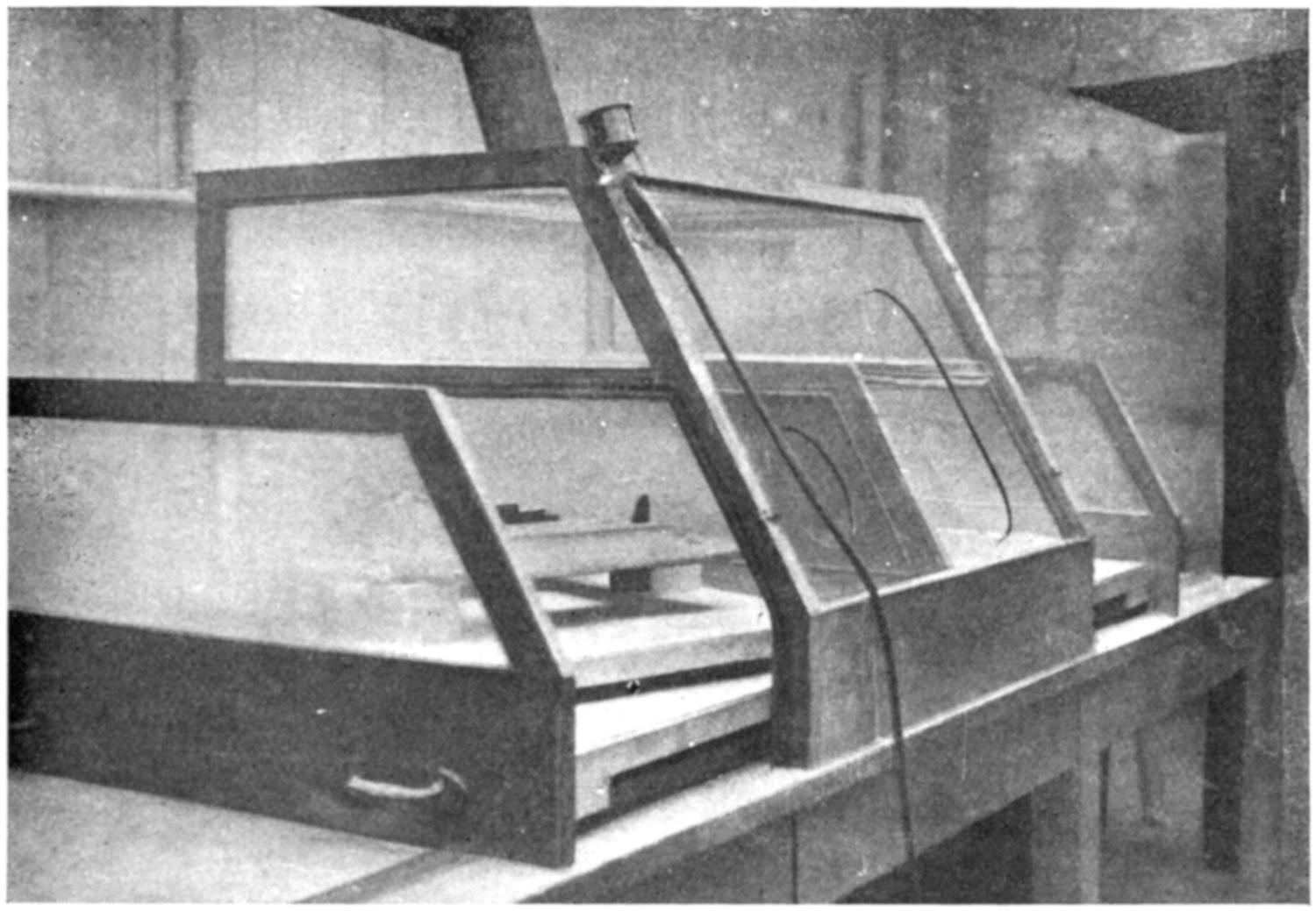 (2) Wooden duct connected up with fan. The area of the openings into the duct could be enlarged or diminished by means of a shutter. The figures in brackets were those obtained when the shutter was fully opened.