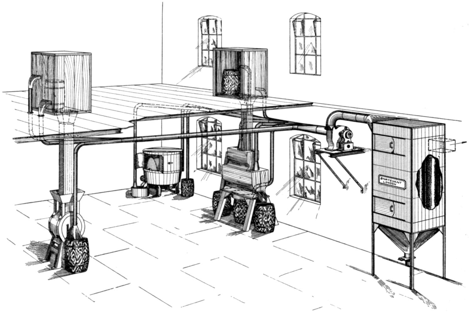 (3) In this factory originally a 2 foot 6 inch fan was simply placed in the wall. Subsequently they were boxed in and ducts of wood brought within a foot of the noddling bar. Four of the branch ducts were found to be blocked.