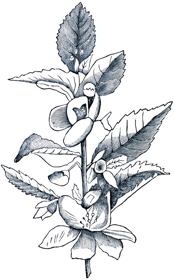 In a wild state is large and bushy, ranging in height from ten to fifteen feet, often assuming the proportions of a small tree. While in a state of cultivation its growth is limited by frequent prunings to from three to five feet, forming a polyandrous, shrub evergreen with bushy stem and numerous leafy branches. The leaves are alternate, large, elliptical and obtusely serrated, varied and placed in smooth short-channeled foot-stalks, the calyx being small, 40and divided into five segments. The flowers are white, axilary and slightly fragrant, often three together in separate pedicils, the corolla having from five to nine petals, cohering at the base with filaments numerous and inverted at the base of the corolla. The anthers are large, yellow and tre-foil, the capsule three-celled and three-seeded; and like all other plants in a state of cultivation, it has produced marked varieties, two of which Thea Viridis and Thea Bohea are critically described as distinct species, distinguished from each other in size, color, form and texture of the leaves, as well as other peculiarities.