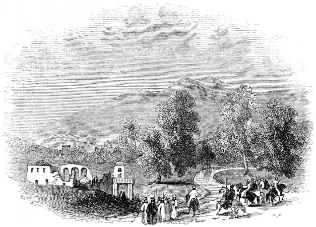 The lights were still before me. I knew that the place of our encampment would be marked by blazing meshals (formed by fixing an iron-hooped cylinder on a pole, and supplying it continually with tarred canvas), and I thought that, at some distance on the[6] left and beyond the village, I observed this very blaze: I therefore left Makhtàrah on my right, and inclined towards them. After I had walked about half an hour, the blaze suddenly disappeared; by degrees, the path, which, from the darkness of the night was now no longer perceptible, became so uncertain, that I was almost fearful to advance, when, on a sudden, I found myself on a descent and within hearing of the sound of a torrent. Stepping with caution and difficulty, I came to a bridge over a rushing water, which I judged to be the river Ewely. I crossed it, but was no sooner over than I lost all traces of the path, and found my farther advance opposed by a precipice.