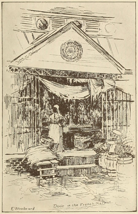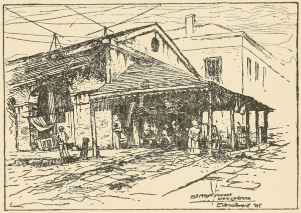 The very first day in the city happened to be a Sunday. She was up and ready betimes to go[304] to the French Market, where I used to go once in a great while and take coffee at Manette’s stall. It was a shock to her to see the ramshackle old market she had heard so much about, and whose praises had been sung to her by her Southern mother. No Manette. No stall where she could have been induced to take a cup of coffee; but a few steps off and a perspective view revealed to her cultivated eye the very sketch she wanted, the very thing she “came all the way to New Orleans for”—and a plan was formulated to go another day when the light would be more favorable.