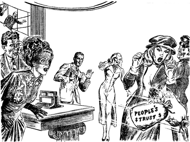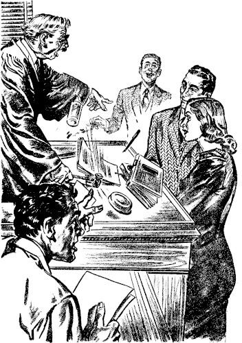 "Sure, your Honor." The girl winked broadly at her sisters-in-arms on the sidelines. "It's a cinch." She turned to the two men standing before her. Her hand went promptly toward the one on the right, and she looked back at the Justice. "That's the one, your...." Suddenly her voice faltered and trailed away into silence. She turned back to the men and her eyes darted crazily back and forth, from face to face.