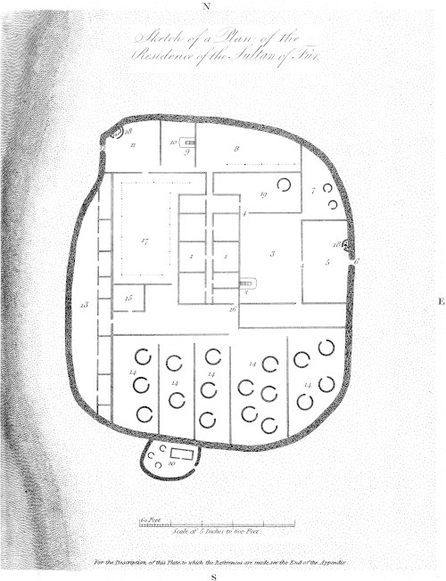 14. A large court of irregular form filled with a multitude of small apartments for the women; they pass through the two gates marked w to fetch water, but have no other outlet. Each of the principal women has a large apartment, surrounded by a number of smaller ones for her slaves; there are also apartments for cooking.