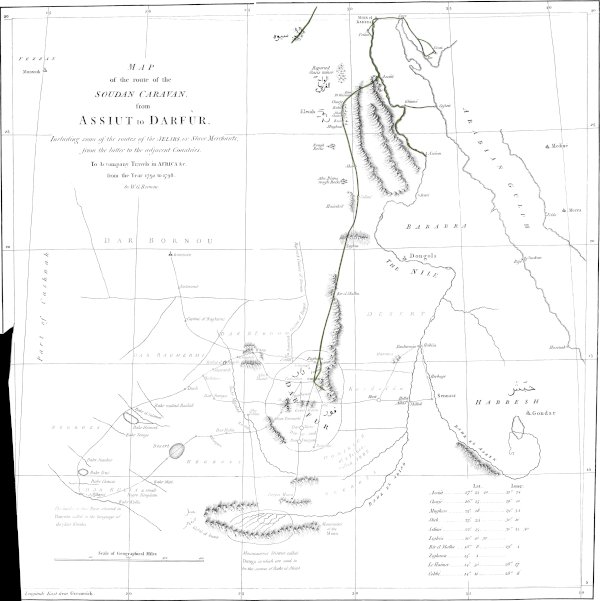 Nothing can well be more vague than the use of the word Soudan or Sûdan. Among the Egyptians and Arabs Ber-es-Soudan is the place where the caravans arrive, when they reach the first habitable part of Dar-Fûr: but that country seems its eastern extremity; for I never heard it applied to Kordofân or Sennaar. It is used equally in Dar-Fûr to express the country to the West; but on the whole seems ordinarily applied to signify that part of the land of the blacks nearest Egypt.