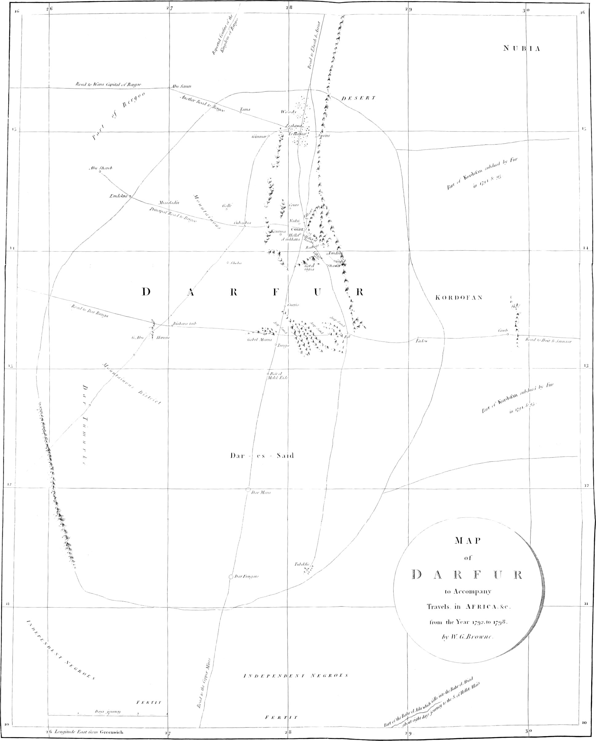 The writer is aware, that when the length of the time he passed in Dar-Fûr is considered, the short account here given will appear, to persons accustomed to the busy scenes of Europe, but very imperfectly to fill up the void. Confiding, however, that those of more reflection and experience in travelling, will be better pleased with a short and clear narrative of what really happened, than by frivolous anecdotes or remarks, inserted merely to swell the size of the volume, he has contented himself with extracting from his journal the principal occurrences during his residence there, and giving them the connection required; at the same time omitting nothing that could any way contribute to throw light on[viii] the state of the country, or character of the inhabitants.