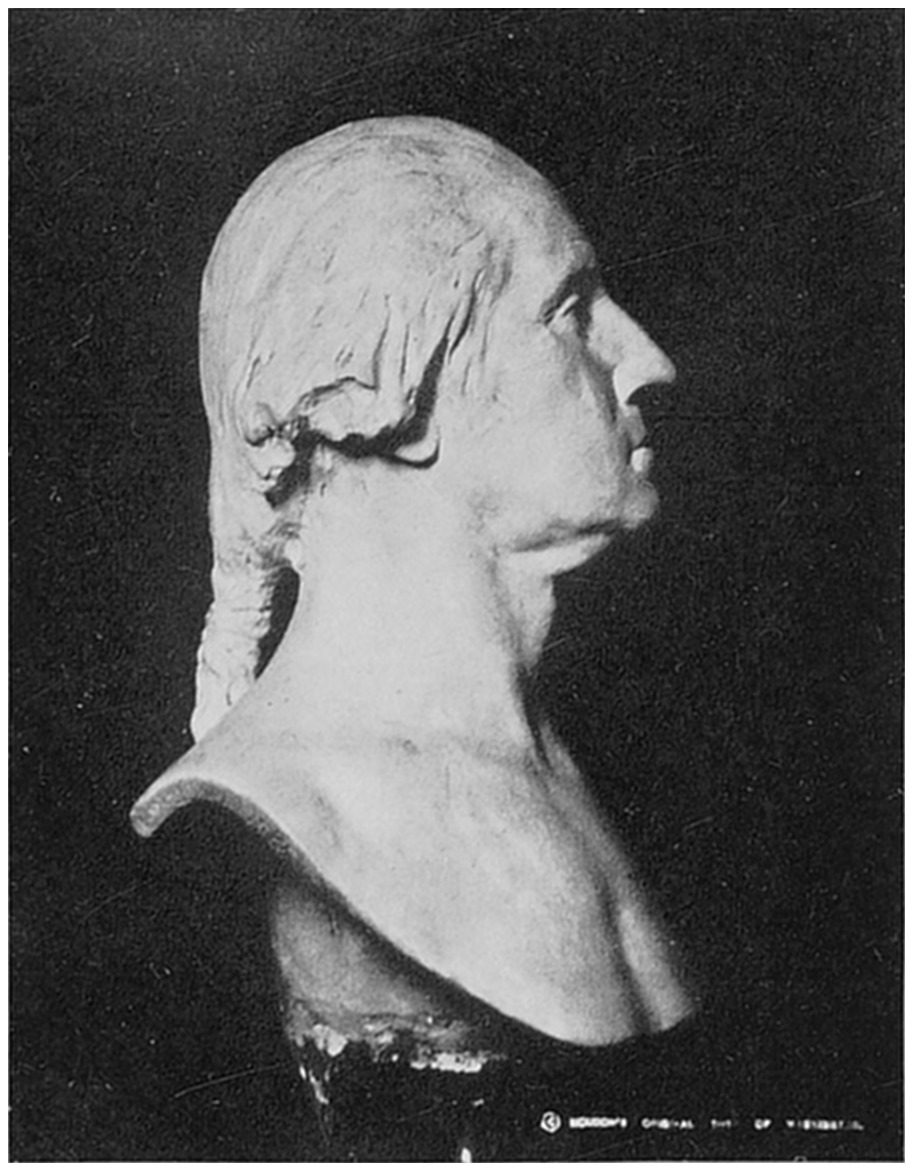 A strong representation of real life was exactly what Thomas Jefferson wanted for the State Capitol of Virginia when he induced the great French sculptor Houdon to “leave the statues of Kings unfinished,” and to cross the Atlantic to take casts, measurements, and artistic cognizance of the person of George Washington, in order to create that marble portrait statue still holding its own in the good top light of the Rotunda at Richmond. To cross the Atlantic, what an adventure for a home-keeping Frenchman in the eighteenth century! Yet in the year 1785, there must have been uneasiness8 at home as well as abroad for Monsieur Houdon, so soon to become le citoyen Houdon. In the midst of our early Republican simplicities, there had been talk of an equestrian statue also. Justified in the hope of obtaining the commission equestrian as well as the commission pedestrian, Houdon accordingly spends a fortnight at Mount Vernon, taking casts, and “forming the General’s bust in plaister.” Later, however, the project of the equestrian statue is dropped, to Houdon’s natural regret.