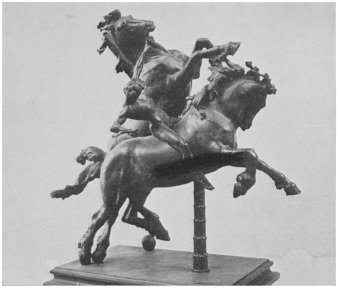 A genius for animals is found rather often among us, as befits a people whose fathers so lately subdued the forest-born; it is a gift as richly special and as deeply innate as the gift, let us say, for religious sculpture, or for any other lofty form. Through this gift, Miss Hyatt and Miss Gardin, Mr. Harvey, Mr. Roth, Mr. Potter, Mr. Laessle, Mr. Sanford, Mr. Rumsey and many others have shown us beautiful or terrible or humorous things. The presence of the horse, the cheval, easily gives the authentic accent of chivalry to the equestrian portrait statue, as contrasted with its pedestrian relative; while in a work imagined in the manner of the Saint-Gaudens Sherman, the beast, the man, and the embodied spirit unite in an epical ensemble that appeals to the thoughtful mind. One thinks of that similar trinity of Earth, Man, and Heaven, said to animate in humbler guise every143 flower arrangement poetically shaped by Japanese fingers. An artistic impulse so widely felt, though not yet commonly revealed, holds out its promise for future creations in art. At present, the fact that Reinhold Begas in Germany and Augustus Saint-Gaudens in America have lately used this motive in equestrian art is perhaps unduly prohibitive for other sculptors. True, neither artist knew what the other was doing; Saint-Gaudens was somewhat taken aback on learning of the Begas design.