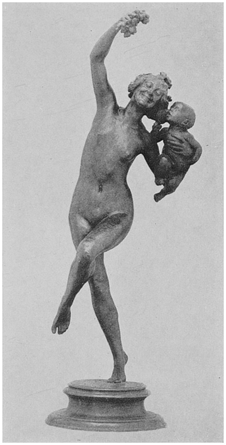 Akin to the faculty for creating garden sculpture is the gift for designing those “small bronzes” in which American connoisseurs are now taking a happy interest. The general public also is being made familiar with the best of these pieces; a result reached through the initiative of the National Sculpture Society and the enthusiasm of our American Federation of Arts in sending out traveling exhibitions of small bronzes to various cities. The small bronze may be either a potentially perfect reduction from some full-sized masterpiece, as in the well-known178 Saint-Gaudens reliefs reduced from larger originals; or it may on the other hand be designed from the start in the ultimate size. Both types are excellent. American sculpture today counts scores of artists with a sure and delightful touch for the latter type. Some of our women sculptors have created little masterpieces in this intimate and friendly form.