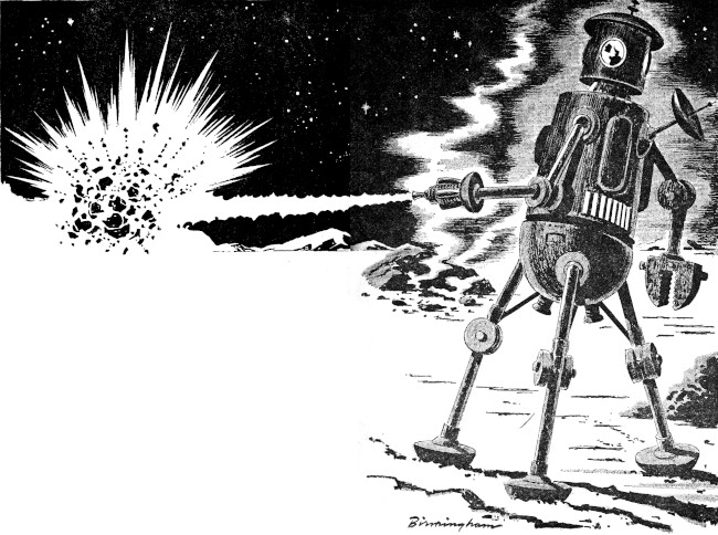 Bigboss was by far the most magnificent member of the clan—if indeed, he should condescend to regard himself as belonging to the set at all. Fully twice the size of any of the others, he reared pompously erect on four stout appendages. Through its ports, his central section offered glowing evidence of the nuclear processes within. Majestic in stance, he swung a pair of formidable members—the auxiliary blaster and a massive, extensible vise.