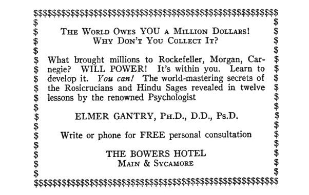 Bill had been speaking without affection of Dr. Gantry when Mannie leered, “Say, jeeze, Bill, your Doc Gantry is going to get his! Oh, I got him where I want him! And maybe it won’t cost him some money to be so popular with the ladies!”