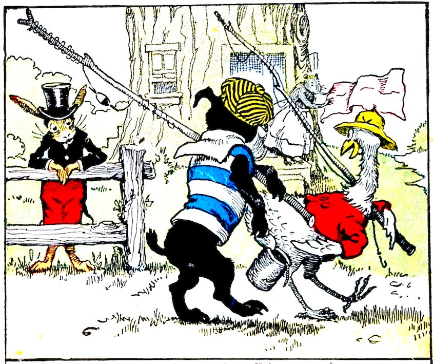 “Where are you going, boys?” asked Uncle Wiggily Longears, the bunny rabbit gentleman one day, as he stood in front of his hollow stump bungalow. Nurse Jane was on the steps, shaking the wrinkles out of the table cloth. Going past, with poles over their shoulders, was Jackie Bow Wow, the puppy dog boy, and Charlie Chick, the little rooster chap. “Where are you going?” Uncle Wiggily asked them. “Fishing,” answered Jackie. “Don’t you want to come?” crowed Charlie, the rooster. “Yes, I think I might go, later on, perhaps,” said Uncle Wiggily.