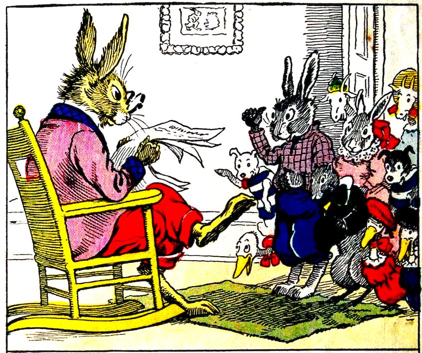 Uncle Wiggily Longears, the bunny rabbit gentleman, leaned on the gate in front of his hollow stump bungalow one day. He was all dressed up to take a walk, but didn’t know where to go. All at once he saw Johnnie and Billie Bushytail, the two squirrel boys. “Where are you going, Johnnie and Billie?” asked the bunny uncle. “We are going to the woods for some chestnuts and hickorynuts,” answered Johnnie. “Mother puts them in our cake.” Uncle Wiggily said that was fine. “I wonder if Nurse Jane will bake a cake if I get some nuts?” said Uncle Wiggily.