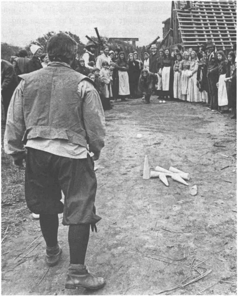 Plymouth’s Harvest Home conformed in most essentials to its English prototype. It was, for example, deliberately long. William Bradford, the governor, began the holiday when he sent out four of the best hunters for fresh meat.[Pg 9] They returned that evening with enough fowl—geese, ducks, and possibly turkeys—to last a week. During this period there were various traditional “recreations,” one of which was parading of sorts. In England villagers customarily marched through the fields of stubble, singing the old harvest songs, waving handfuls of grain often plaited into kern or corn dolls. The men would then demonstrate their prowess with firearms or longbows. When Winslow writes, “... amongst other recreations; we exercised our arms,” he is referring to customs like these. It is doubtful that any kern dolls were fashioned at Plymouth; Puritans did not take kindly to graven images of the Mother Earth or Mary sort. But they had muskets and fowling pieces, and under the command of Miles Standish, a professional soldier, they acquired some of the noisier martial skills. Harvest Home gave them a chance to demonstrate these to each other and to Massasoit’s Indians. The turkey shoot held in many rural communities before Thanksgiving is a modern survival of this harvest custom. Another traditional recreation was athletics. Englishmen were serious sportsmen. King James had even issued a Book of Sports in 1618, which enumerated those “lawfulsports” like “archery for men, leaping, vaulting, or any other such harmless recreation ...” suitable for playing after church. Puritans were not against sports as such, but they were against them on religious holidays; the Sabbath was not made for sporting. For example, on Christmas Day, 1621, William Bradford chided some of the newer settlers in Plymouth for playing “stool ball” (an ancestor of cricket) and “pitching the bar” (weight throwing):