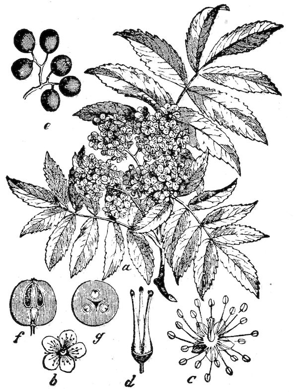 The Witch-Hazel, or American Hamamelis, has many superficial points of resemblance to the common alder, beside its attachment to wet, muddy soils. Its ramification is peculiar; its side branches are very short, and, like the alder, it sends from one root a number of branches diverging outwards, but with an inward curvature of their extremities. The leaves are alternate and ovate, narrowest toward the stem and feather-veined. They turn to a sort of buff-color just before the flowers appear, which are yellow, having long linear petals, without beauty, growing in a cluster of four or five in the axils of the leaves. This 267tree is worthy of attention chiefly as a curiosity. Like the witch-elm of Great Britain, it was formerly used for divining-rods. Its magic powers might have been suggested by its remarkable habit of bearing flowers late in the autumn, thereby reversing the general order of nature; also by producing buds, flowers, and fruit in perfection at the same time. All such phenomena might be supposed to have some connection with witchcraft.