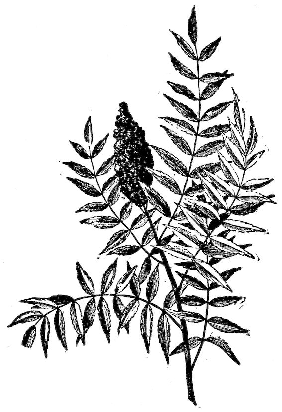 The leaves of the Ailantus are pinnate, containing from nine to eleven leaflets, each of these being as large as the leaf of the beech-tree. It has a great superficial resemblance to the velvet sumach, both in its foliage and ramification, so that on first sight one might easily be mistaken for the other; for its branches, though more elegant, have the same peculiar twist that gives the spray of the sumach the appearance of a stag’s horn. The flowers are greenish, inconspicuous, and in upright panicles, resembling those of the poison sumach. They emit a very disagreeable odor while the flowers are in perfection, impregnating the air for a week or more.