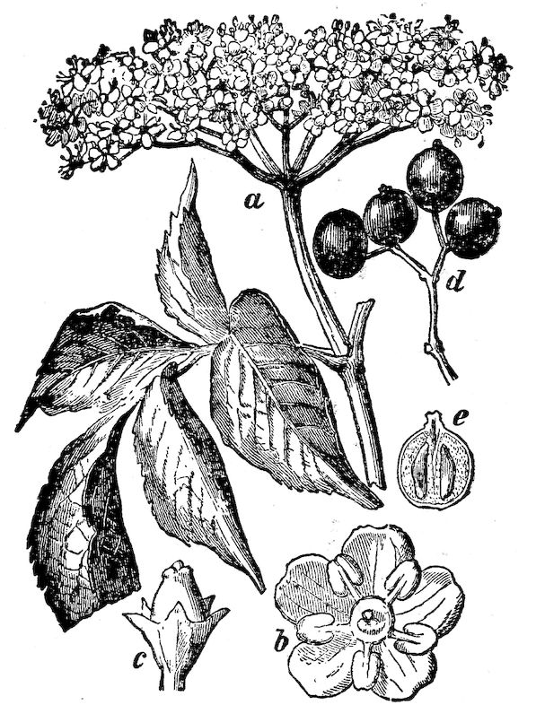 The Privet is a much handsomer shrub of an allied family. Its foliage is more delicate, both in hue and texture, not so thin, and almost evergreen. It has become extensively naturalized in our woods, and is distinguished by its clusters of white flowers in summer and its black, shining berries in autumn. It is abundant in all lands once tilled which have become wild, in the vicinity of our old towns, and was probably introduced at an early period for an ornamental hedge plant.
