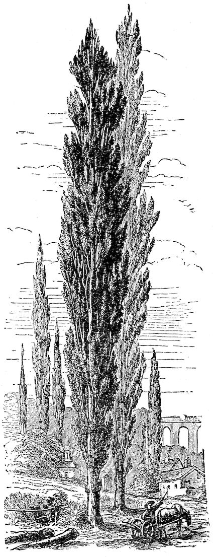 There is no other tree that so pleasantly adorns the sides of narrow lanes and avenues, or so neatly accommodates itself to limited enclosures. Its foliage is dense and of the liveliest verdure, making delicate music to the soft touch of every breeze. Its terebinthine odors scent the vernal gales that enter our open windows with the morning sun. Its branches, always turning upwards and closely gathered together, afford a harbor to the singing birds, that make them a favorite resort; and its long, tapering spire, that points to heaven, gives an air of cheerfulness and religious tranquillity to village scenery.