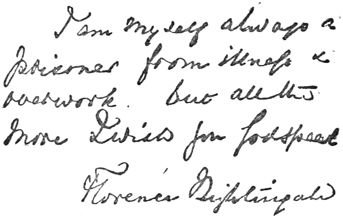 After her beloved sister’s death Miss Nightingale was sad and despondent, and one detects the note of weariness in a letter which she addressed in 1890 to the Manchester Police Court Mission for Lads. She was anxious that more should be done to reclaim first offenders and save them from the contaminating influences of prison life. “I have no power of following up this subject,” she wrote, “though it has interested me all my life. For the last (nearly) forty years I have been immersed in two objects, and undertaken what might well occupy twenty vigorous young people, and I am an old and overworked invalid.”