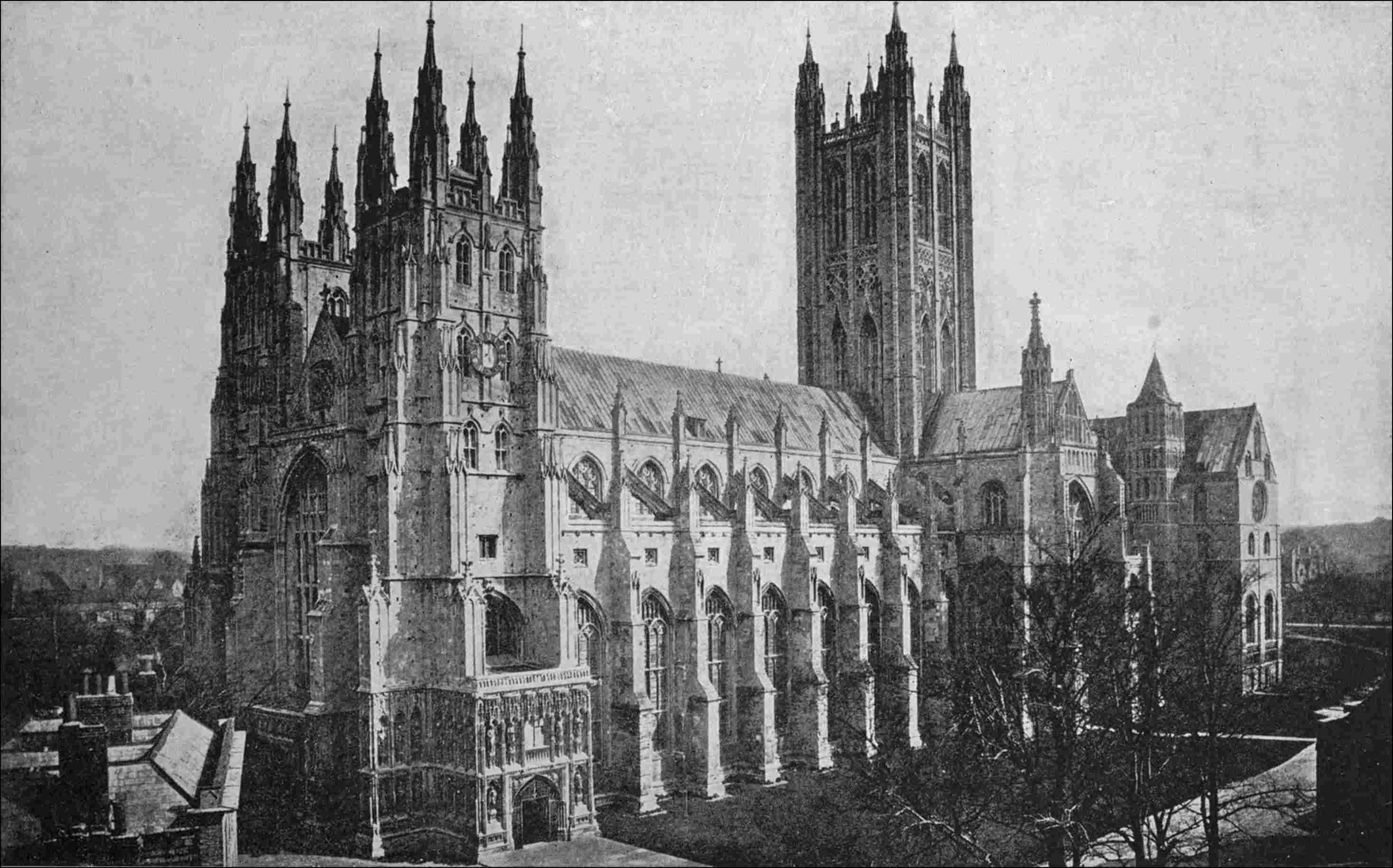 The foundation of St. Martin’s Church and the lower part of its walls, which are Roman, stood in 598 as they stand to-day; and they were the walls of the little church which had been given to the Christian Queen Bertha and her chaplain Bishop Luithart, by her pagan husband King Ethelbert. When Augustine passed towards the city, as described by the Venerable Bede, with his little procession headed by the monk carrying a board on which was a rough picture of Christ, and a chorister bearing a silver cross, his heart, no doubt, beat high with hope: but his hope would have grown into exultation could he have looked forward through the centuries, and beheld the magnificent Cathedral which was to spring up where his episcopal throne was fixed, and the energetic and varied Christian life which has issued from this first home of Anglo-Saxon Christianity. To us the scene is full of historical recollections. Between the place where we are standing and the Cathedral are the city walls, on the very site which they occupied in the days of Ethelbert, and the postern-gate through which Queen Bertha came every day to her prayers; in the nearer distance, a little to the right of the Cathedral, are the remains of the great302 abbey which Augustine founded; to our left is the Pilgrims’ Way, by which, after Becket’s canonization, those who landed at Dover made their way to the shrine of St. Thomas.