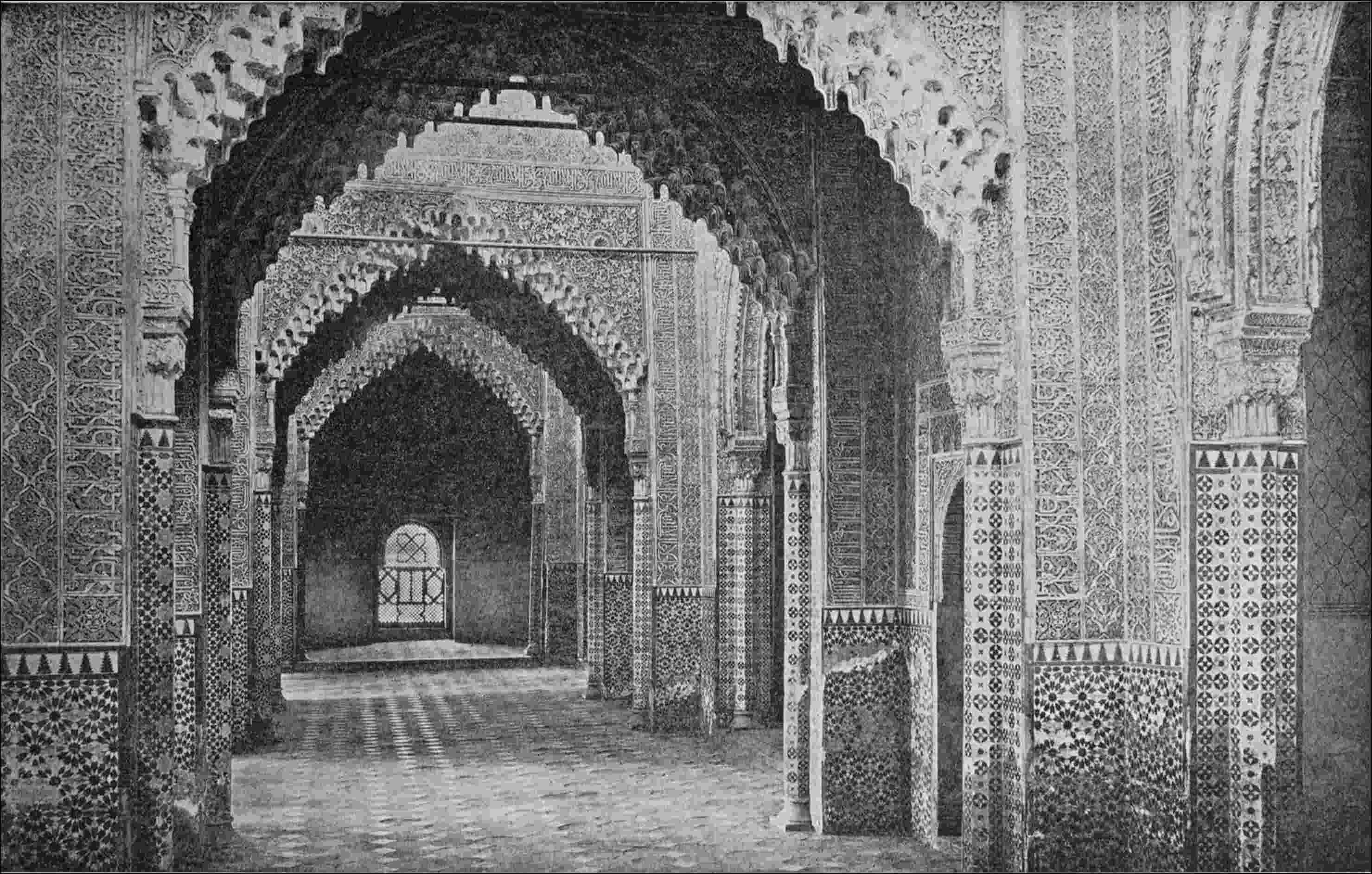 The antechamber of the Hall of the Ambassadors is worthy of the purpose for which it was intended: the boldness of its arches, the variety and interlacing of its arabesques, the mosaics of its walls, and the work on its stuccoed ceiling, crowded like the stalactite roof of a grotto and painted with azure, green, and red, traces of which colours are still visible, produce an effect both charming and bizarre.