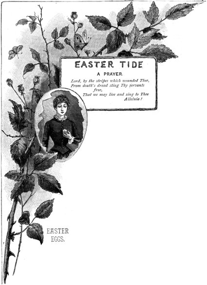 The origin of the practice of connecting eggs with our Easter festival is, I believe, lost in antiquity; but they are said to have been used by the Jews at the Feast of Passover. In some Eastern countries there is a very old custom, which still prevails, of presenting eggs at this season of the year—some say because the egg is an emblem of creation, or recreation, there being a tradition that the world was created in the spring. In parts of Russia people present eggs to one another on Easter day, saying, “Jesus Christ is risen,” being answered, “It is so of a truth,” or “Yes, He is risen.” The Russians also serve red eggs on that day, symbolising at the same time the resurrection and the blood of the Saviour.