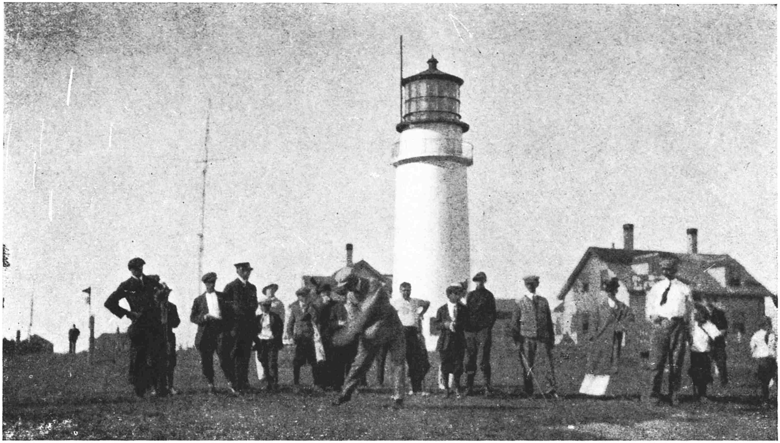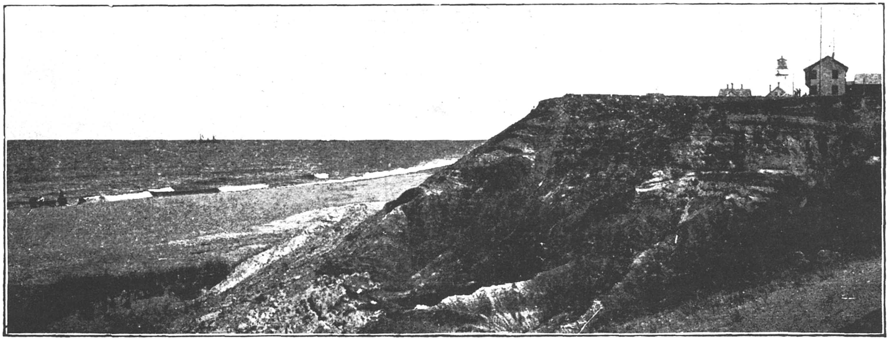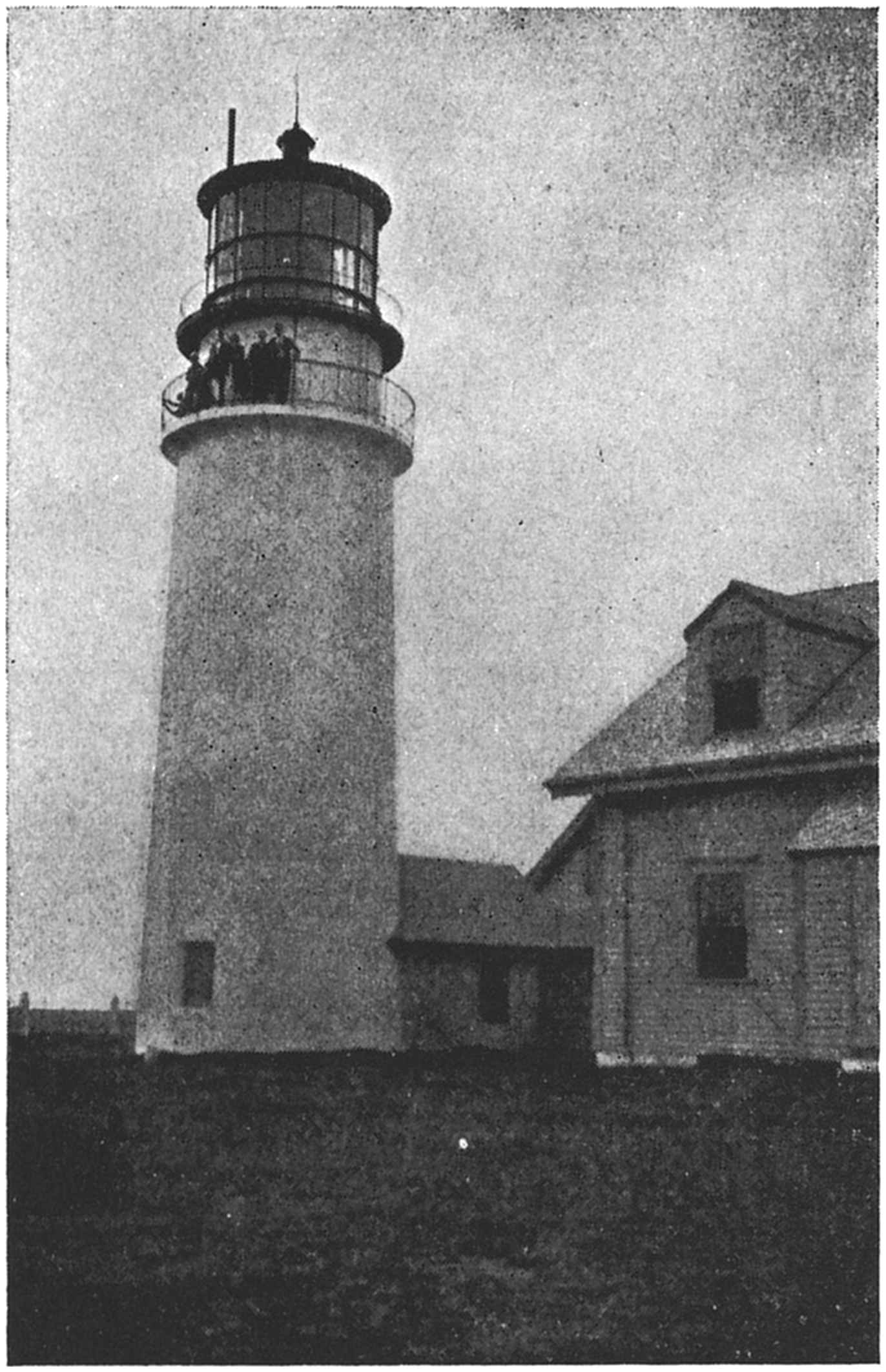 This is known as Cape Cod Light, more often spoken of as Highland Light. It stands on a bluff 140 feet above sea level. The brick tower is 65 feet high. It was built by the United States Government in 1777 and rebuilt in 1851. It is a revolving flash light and its rays can be seen 45 miles at sea.