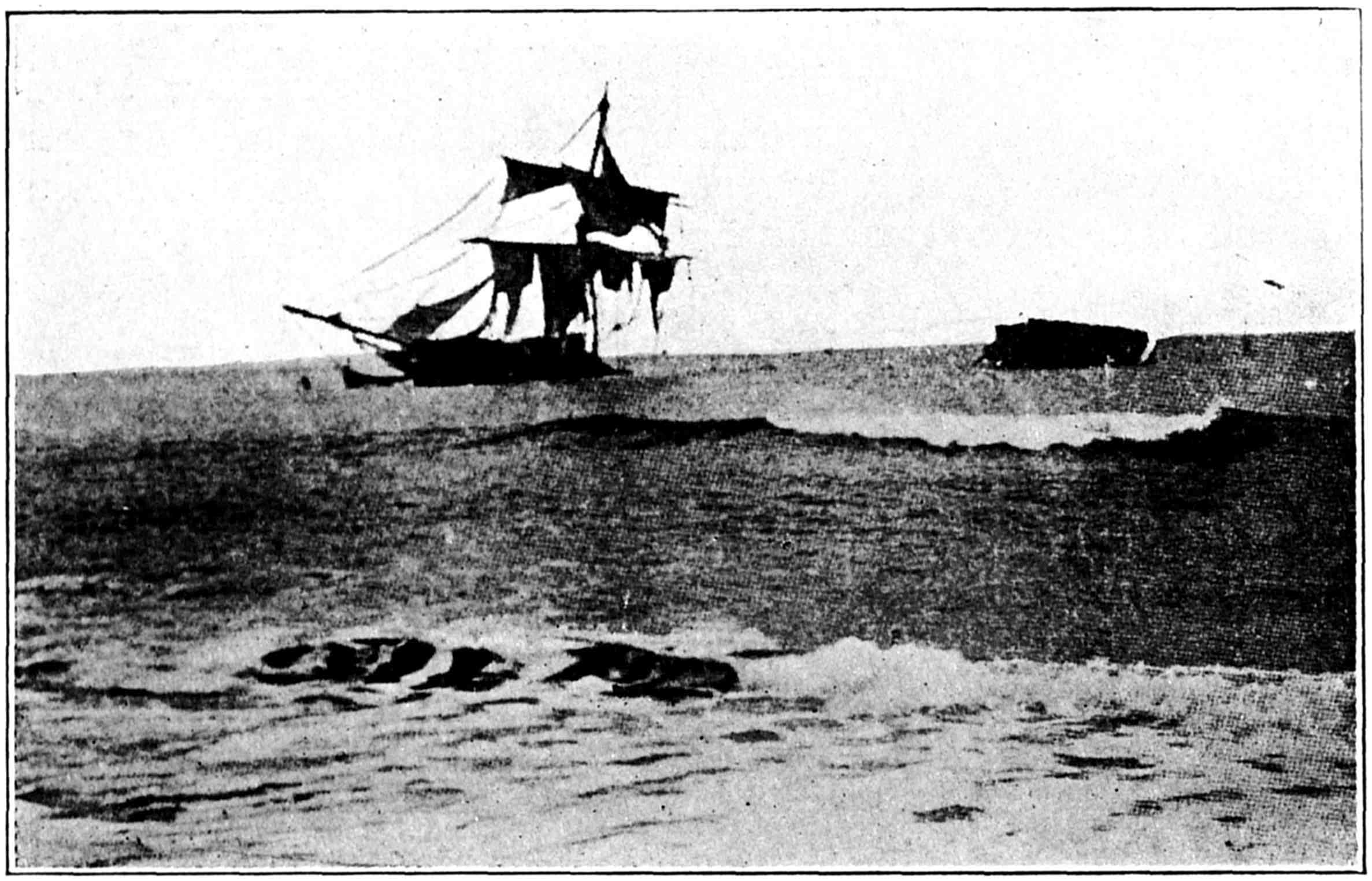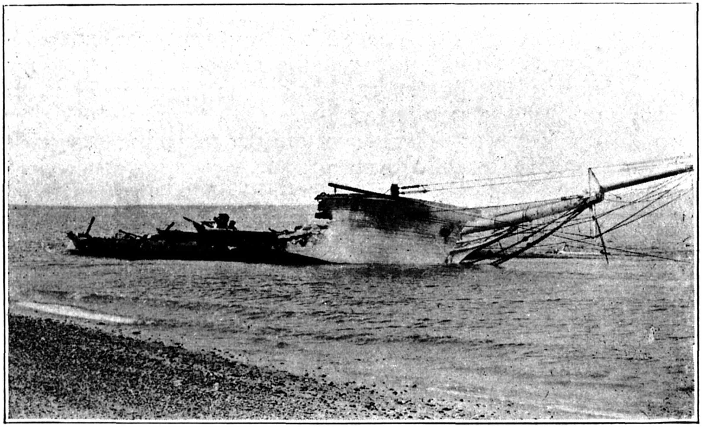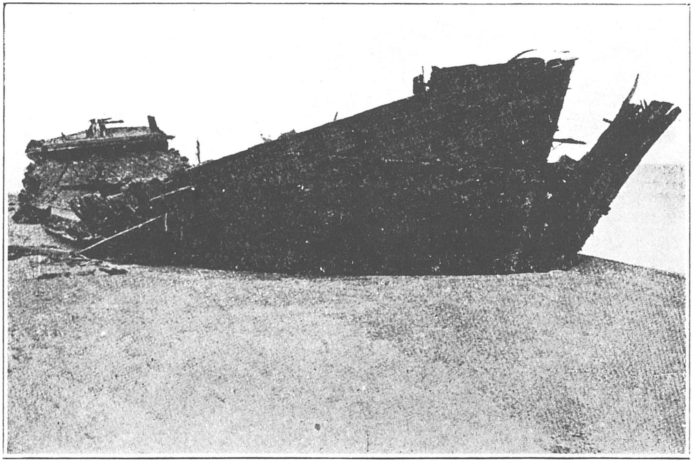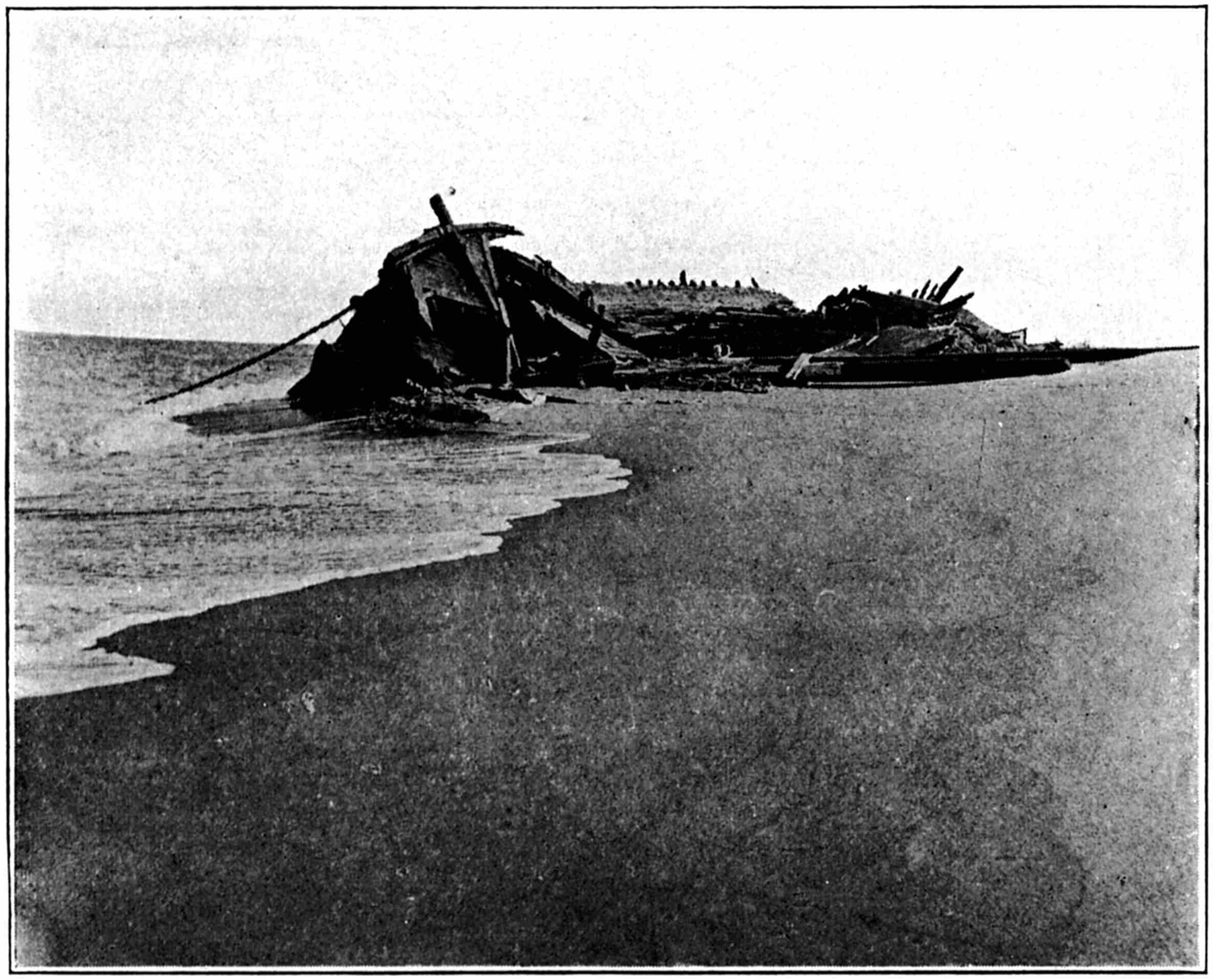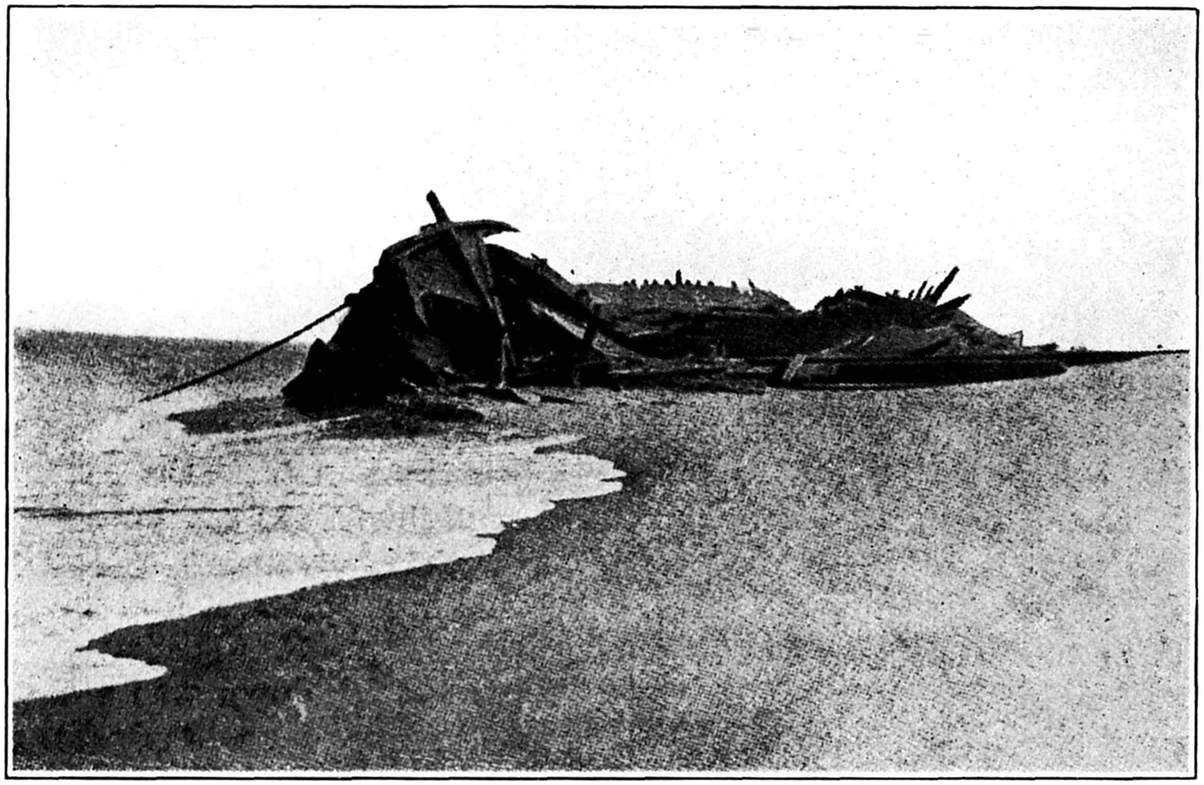 Out there across yonder bar, where you see the waters curl and break into a ripple, forming a white line against the blue of the sea beyond, lies the sunken and sea-washed hull of the once stately ship; in that sparless hull and the rotting and sand covered timbers you cannot recognize the majestic vessel that only a few short years ago sat out there in all her splendor and with her strong sides seemed to defy the elements.