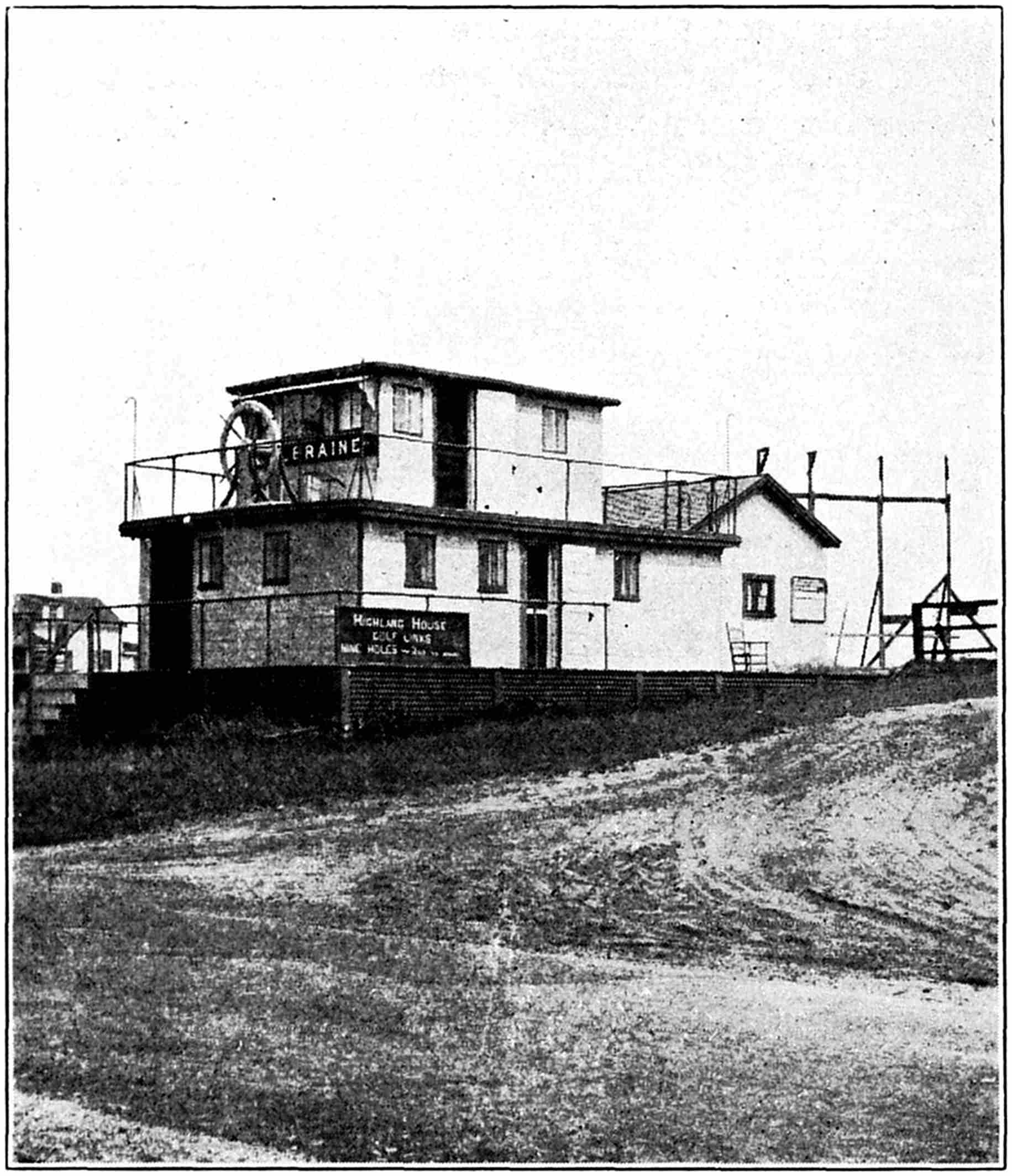 The fury of the gale and the high and rising tide soon forced the barges well up on the beach, so that on the following morning one might walk dry footed entirely around them. The Manheim escaped serious injury. Then began an effort to float her. Soon it was found that the action of the sea and tide was building up a great breakwater of sand around the Tunnel Ridge and Coleraine which were stranded one on each side of the Manheim. There could be no hope of floating the latter until these hulks were removed. Kerosene was liberally poured over them and on a dark night a torch was applied, and the burning hulls lit up the sea and shore for many miles around. When it was decided to burn the barges, Capt.71 Israel told E. Hayes Small if he would send a gang of men on board and remove the deckhouses from the Coleraine he could have them; he did so, and a few days work landed the houses on the sands of the beach, where they were cut into three pieces. Some planks were laid on the slope of the 100 feet high cliff, and with four horses the three parts were skidded to the top of the cliffs; then on trucks the parts were drawn to a point on the south side of the town road leading to Highland Light, there put together and converted to a three-room cottage. Later on, with a small addition on the south side, made the club house of the Highland House golf links.