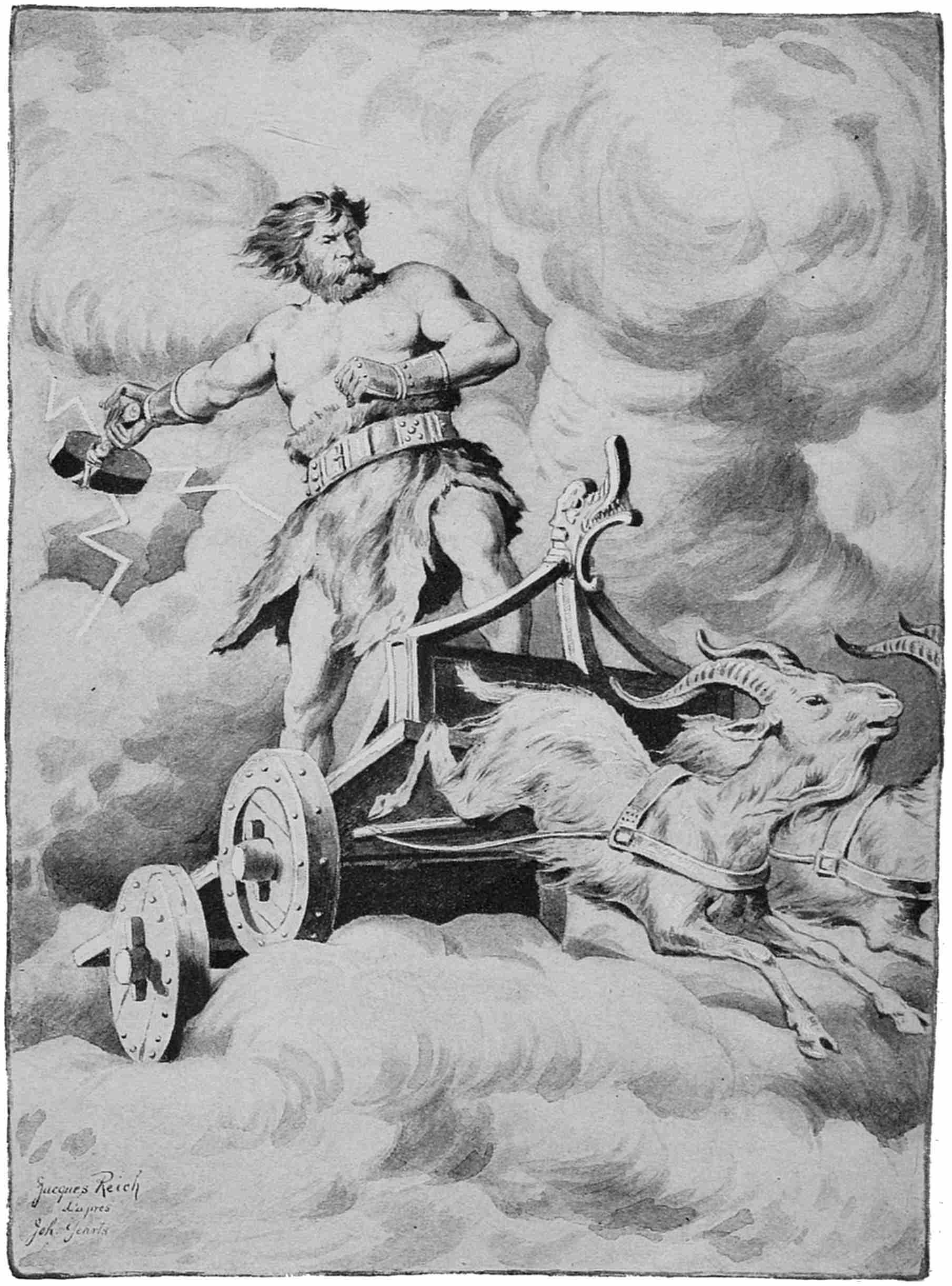 Thor, the Northern thunder-god, also has many points of resemblance with Jupiter. He bears the hammer Miölnir, the Northern emblem of the deadly thunderbolt, and, like Jupiter, uses it freely when warring against the giants. In his rapid growth Thor resembles Mercury, for while the former playfully tosses several loads of ox hides about a few hours after his birth, the latter steals Apollo’s oxen before he is one day old. In physical strength Thor resembles Hercules, who also gave early proofs of uncommon vigor by strangling the serpents sent to slay him in his cradle, and who delighted, later on, in attacking and conquering giants and monsters. Hercules became a woman and took to spinning to please Omphale, the Lydian queen, and Thor assumed a woman’s apparel to visit Thrym and recover his hammer, which had been buried nine rasts underground. The hammer, his principal attribute, was used for many sacred purposes. It consecrated the funeral pyre and the marriage rite, and boundary stakes driven in by a hammer were considered as sacred among Northern nations as the Hermæ or statues of Mercury, whose removal was punished by death.