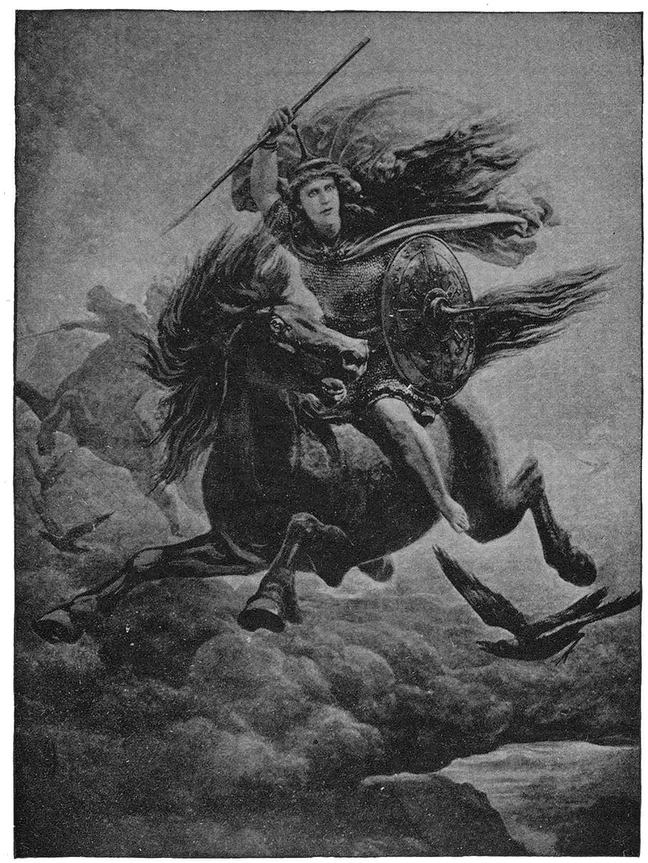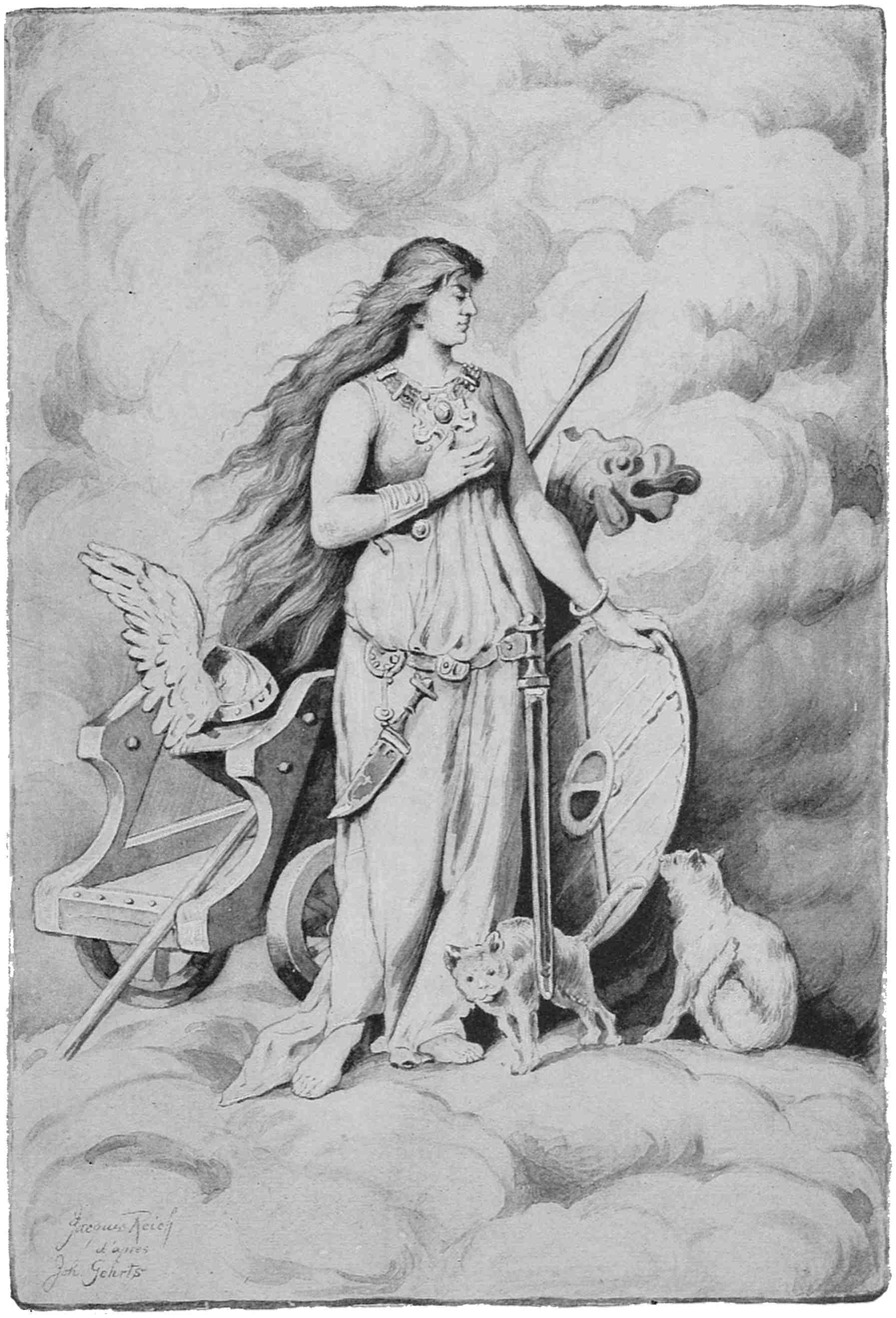 Freya, the goddess of youth, love, and beauty, like Venus, sprang from the sea, for she is a daughter of the sea-god Niörd. Venus shows that she is not entirely devoid of martial tastes by bestowing her best affections upon Mars and Anchises, while Freya often assumes the garb of a Valkyr, and rides rapidly down to earth to take her part in mortal strife and bear away one half of the heroes slain to feast in her halls. Like Venus, she delights in offerings of fruits and flowers, lends a gracious ear to the petitions of lovers, and favors them as much as she can. Freya also resembles Minerva, for, like her, she wears a helmet and breastplate, and, like her, also, she is noted for her beautiful blue eyes.